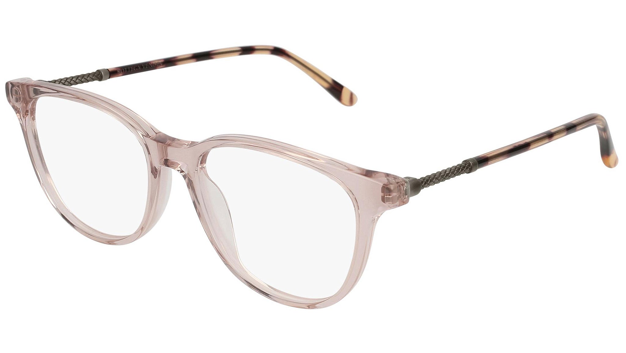 Occhiali da vista Bottega Veneta modello BV0136O 004 featuring shiny transparent nude pink frame and silver temple.