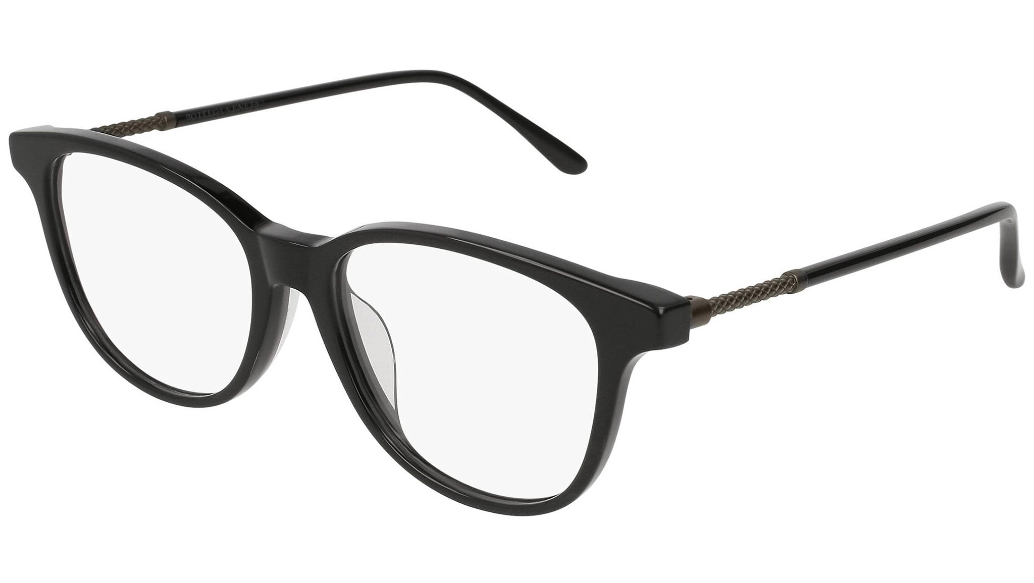 Occhiali da vista Bottega Veneta modello BV0136OA 001 featuring shiny black frame and ruthenium temple.