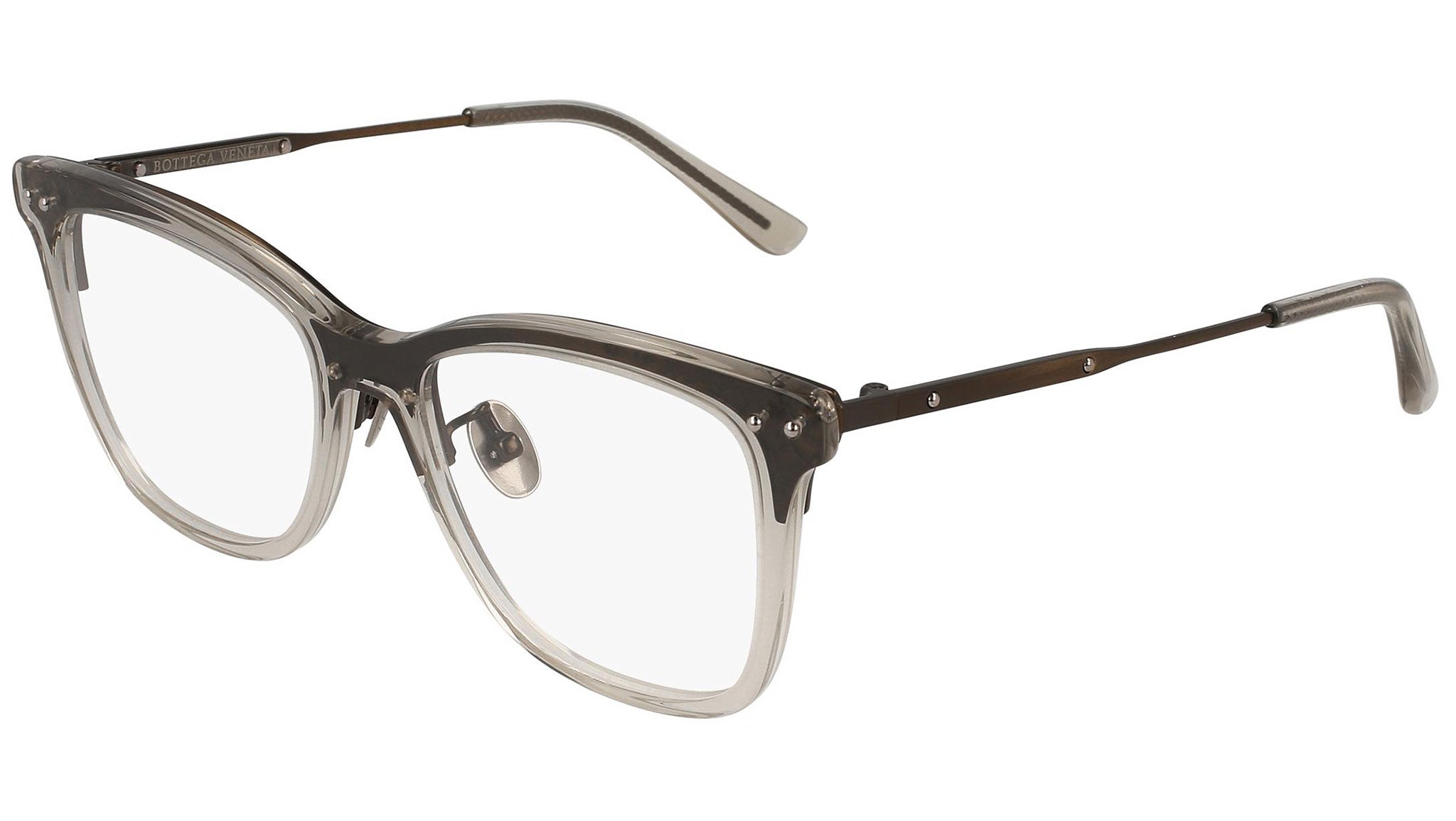 Occhiali da vista Bottega Veneta modello BV0145O 003 featuring shiny transparent mud / semimatte antique brass frame and bronze temple.