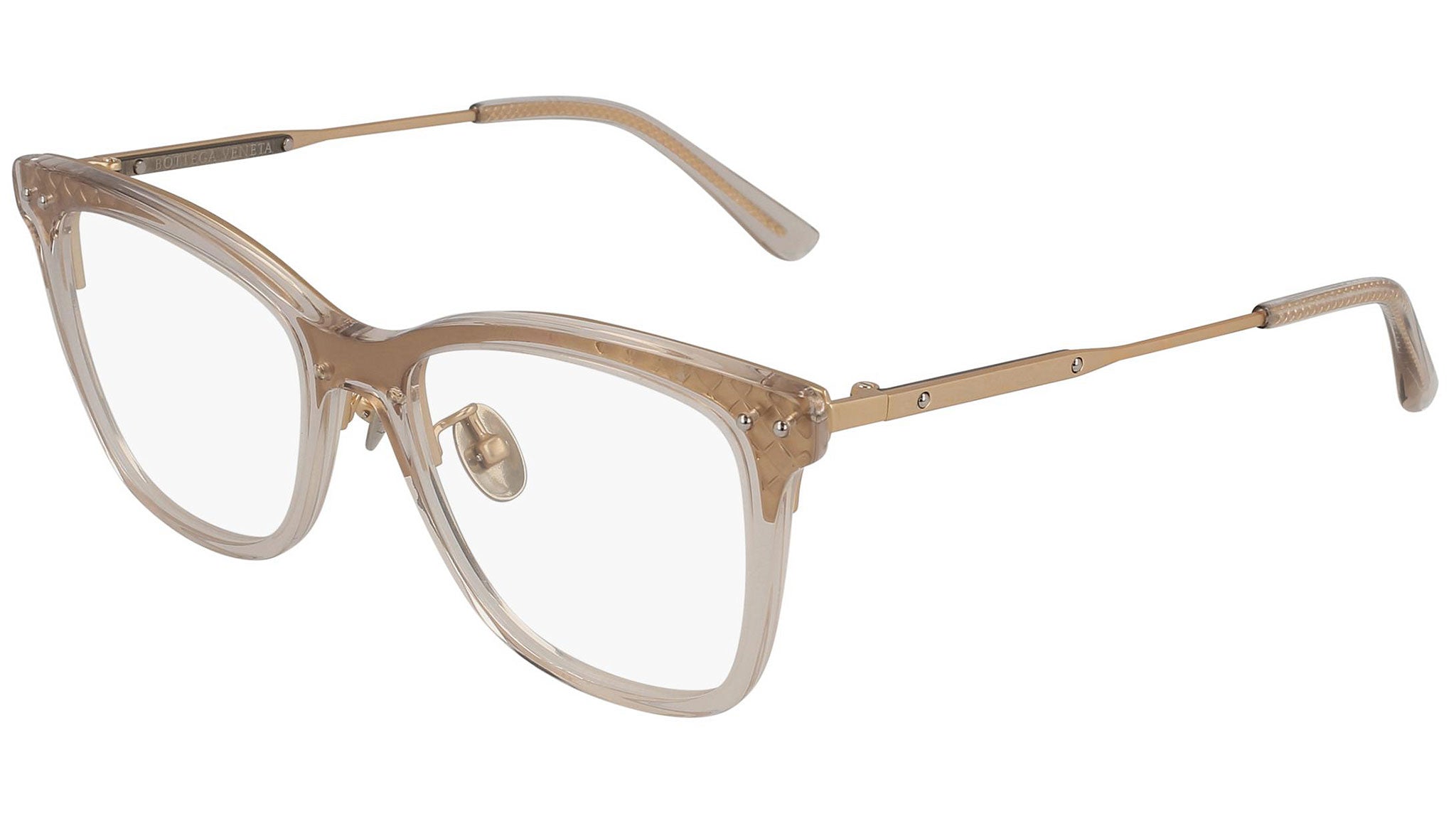 Occhiali da vista Bottega Veneta modello BV0145O 004 featuring shiny transparent powder / semimatte rose gold frame and gold temple.