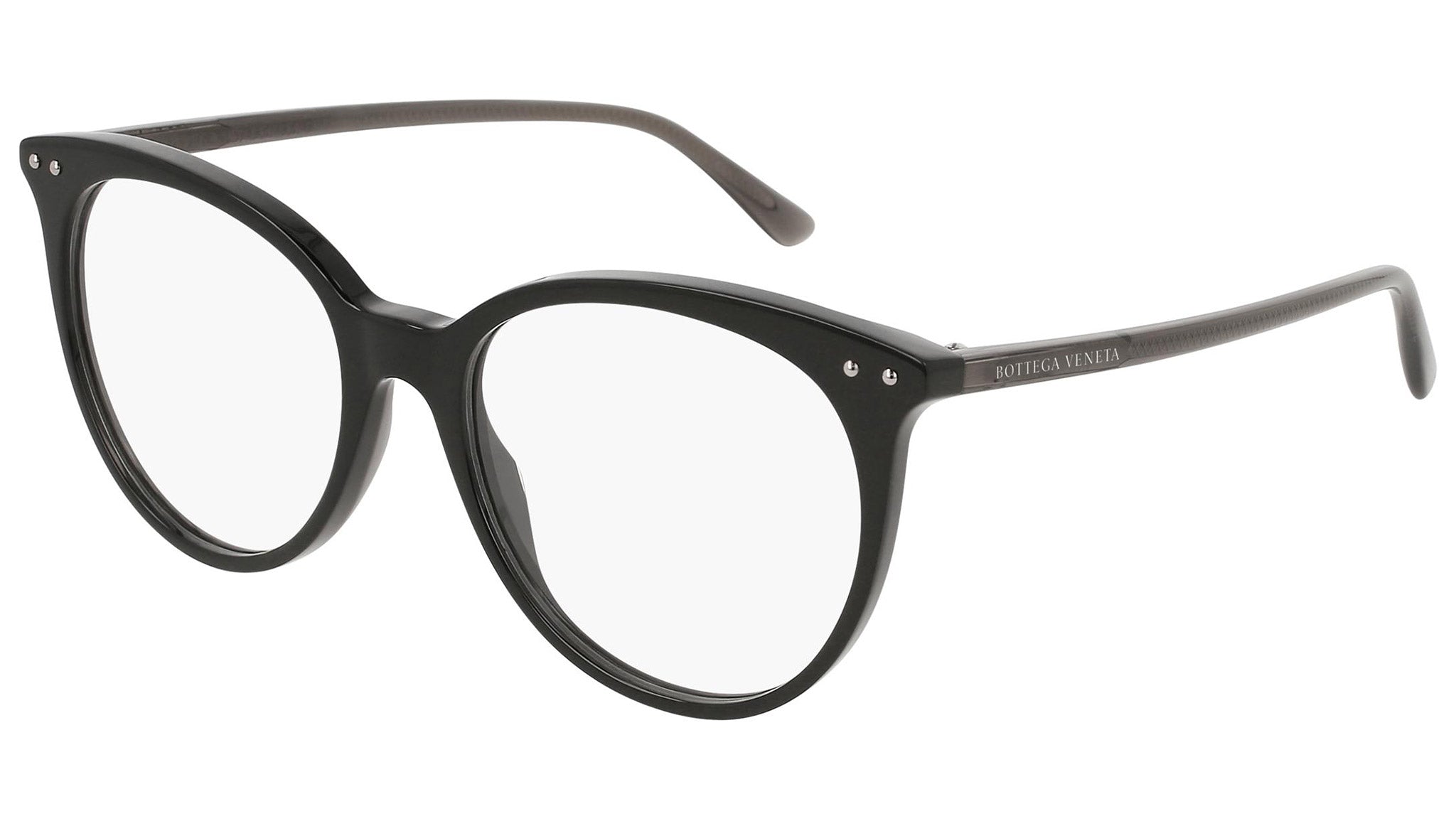 Occhiali da vista Bottega Veneta modello 0162O 001 featuring shiny black front frame and grey temple.