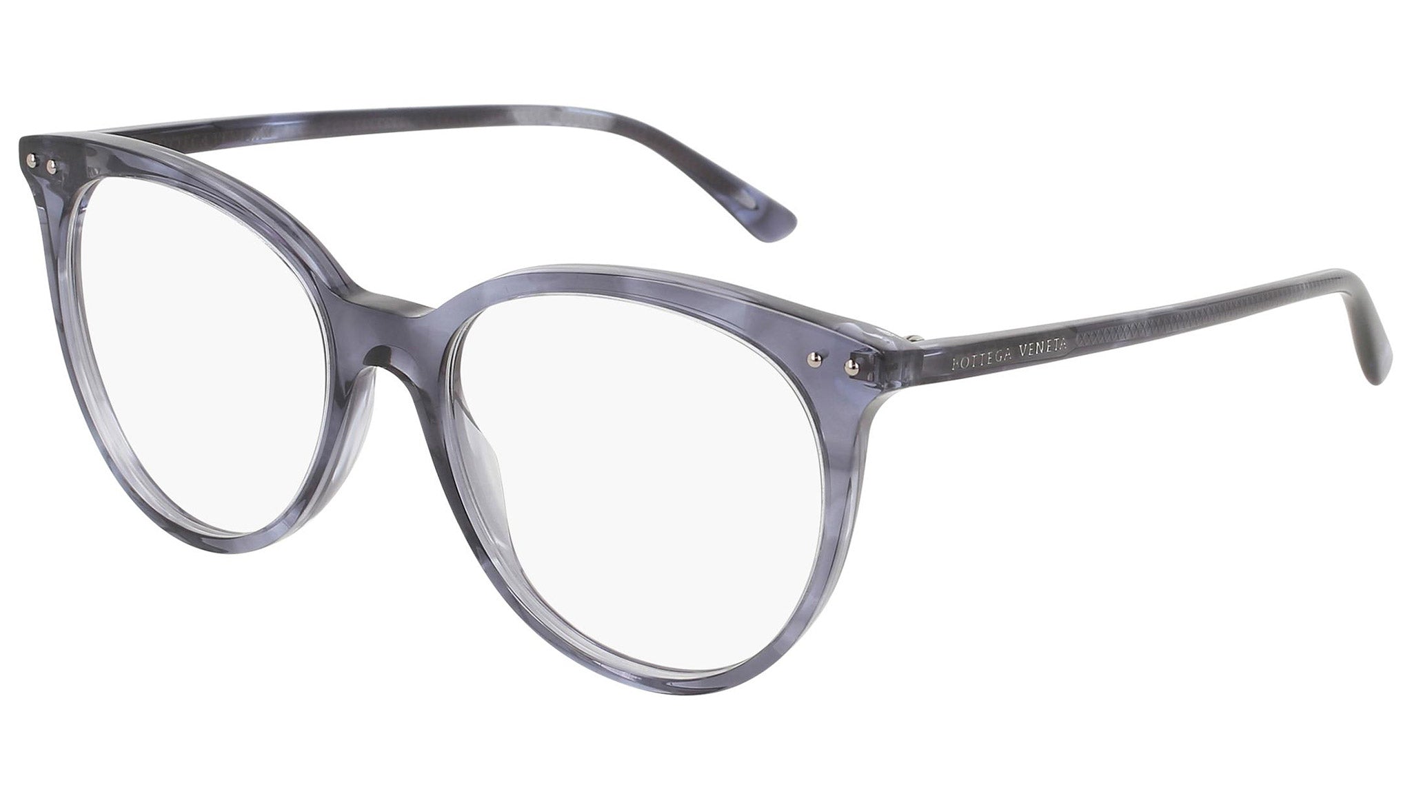 Occhiali da vista Bottega Veneta modello 0162O 004 featuring shiny grey melange front frame and grey temple.