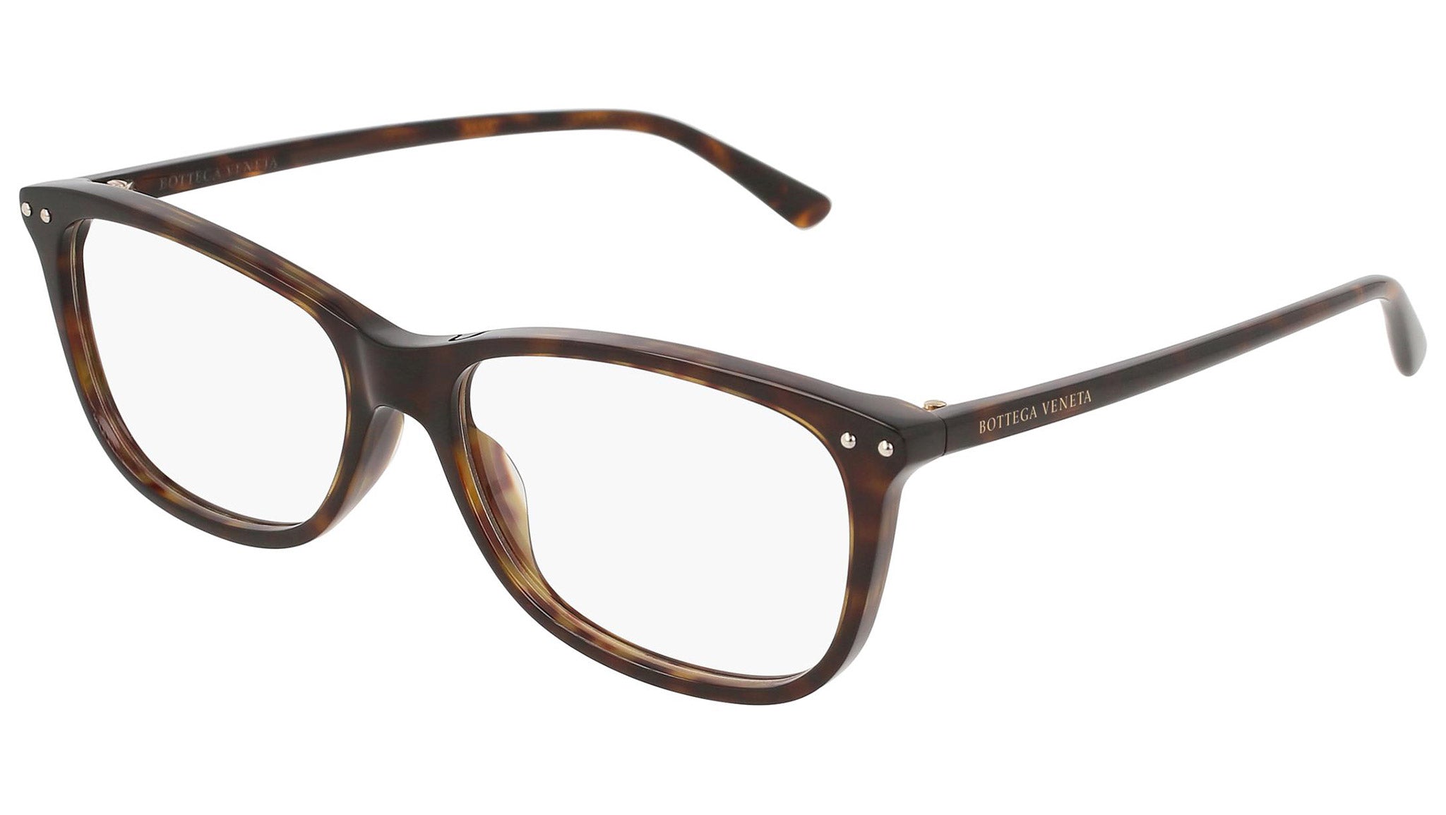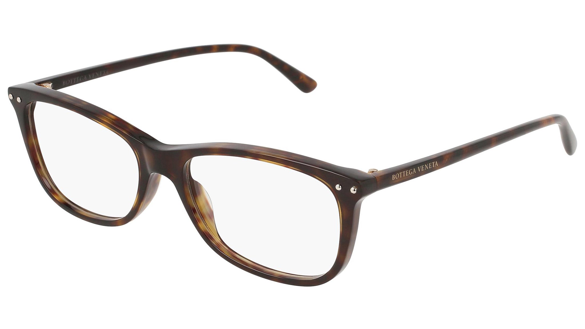 Occhiali da vista Bottega Veneta modello 0164O 002 featuring shiny dark havana front frame and havana temple.