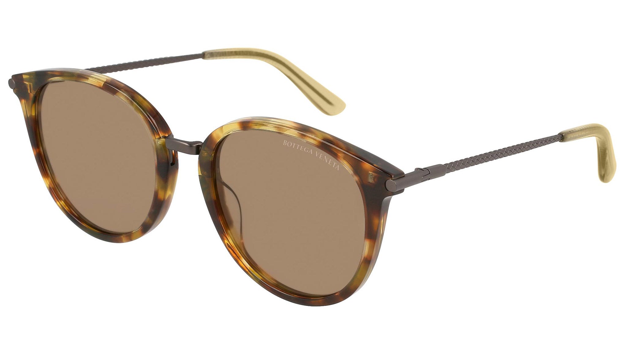 Bottega Veneta sunglasses collection model 0169S 003 featuring shiny green havana and semimatte burnished front frame and solid brown and AR gold lens. Inspired by Italian culture with a global outlook, the House is defined by a distinctly refined attitude. Bottega Veneta uses noble materials to create considered pieces that become part of their owner’s lives.