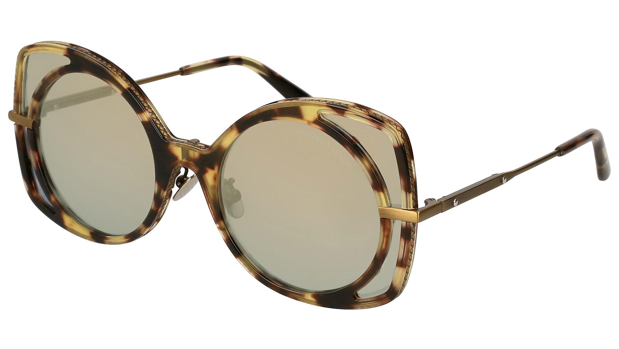 Bottega Veneta sunglasses collection model 0177S 002 featuring shiny spotted brown havana front frame and solid green mirror bronze and AR gold et lens. Inspired by Italian culture with a global outlook, the House is defined by a distinctly refined attitude. Bottega Veneta uses noble materials to create considered pieces that become part of their owner’s lives.