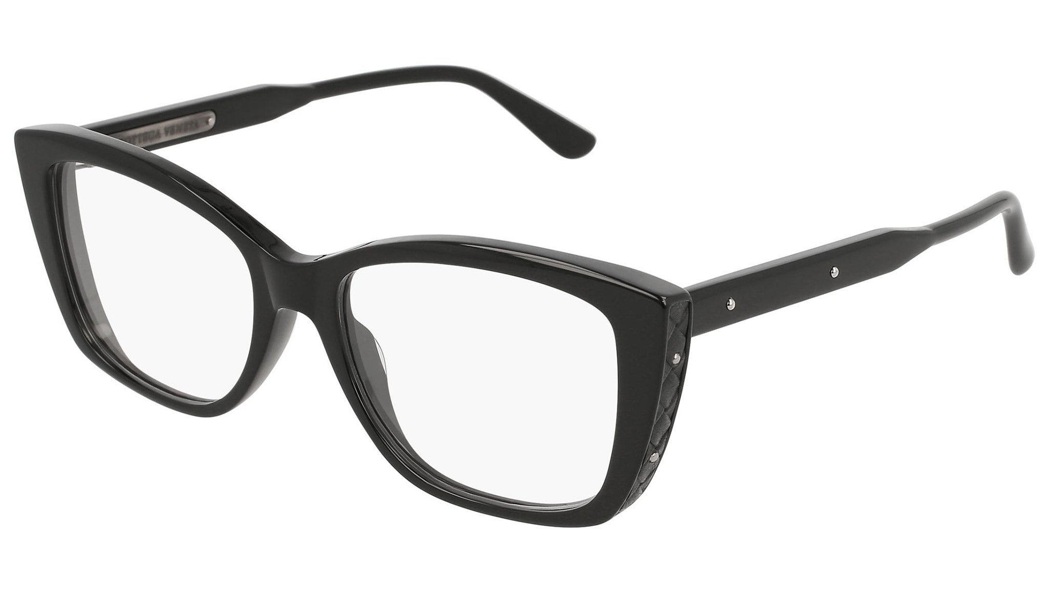 Occhiali da vista Bottega Veneta modello 0183O 001 featuring shiny black and black front frame and black temple.