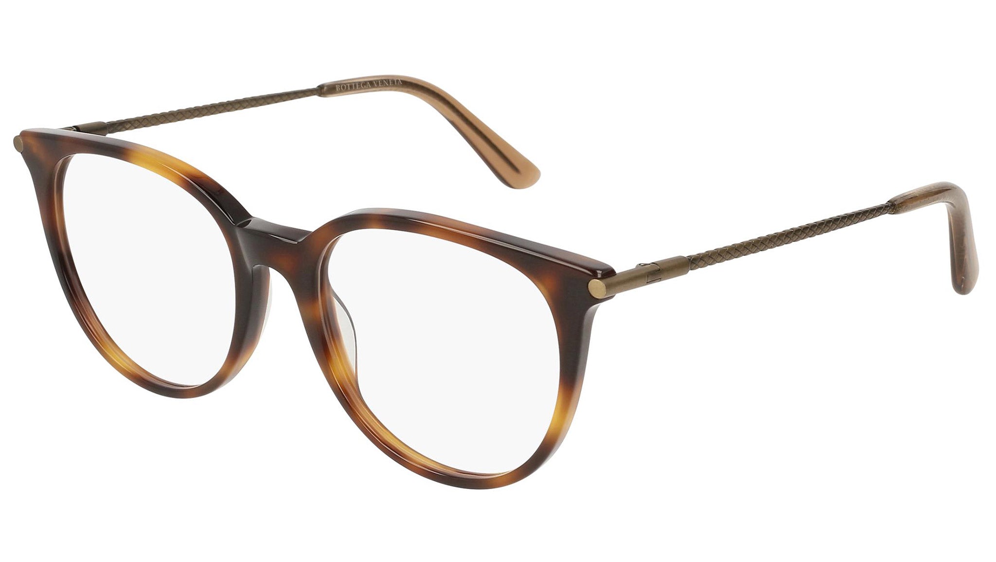 Occhiali da vista Bottega Veneta modello 0184O 002 featuring shiny medium havana front frame and brown temple.