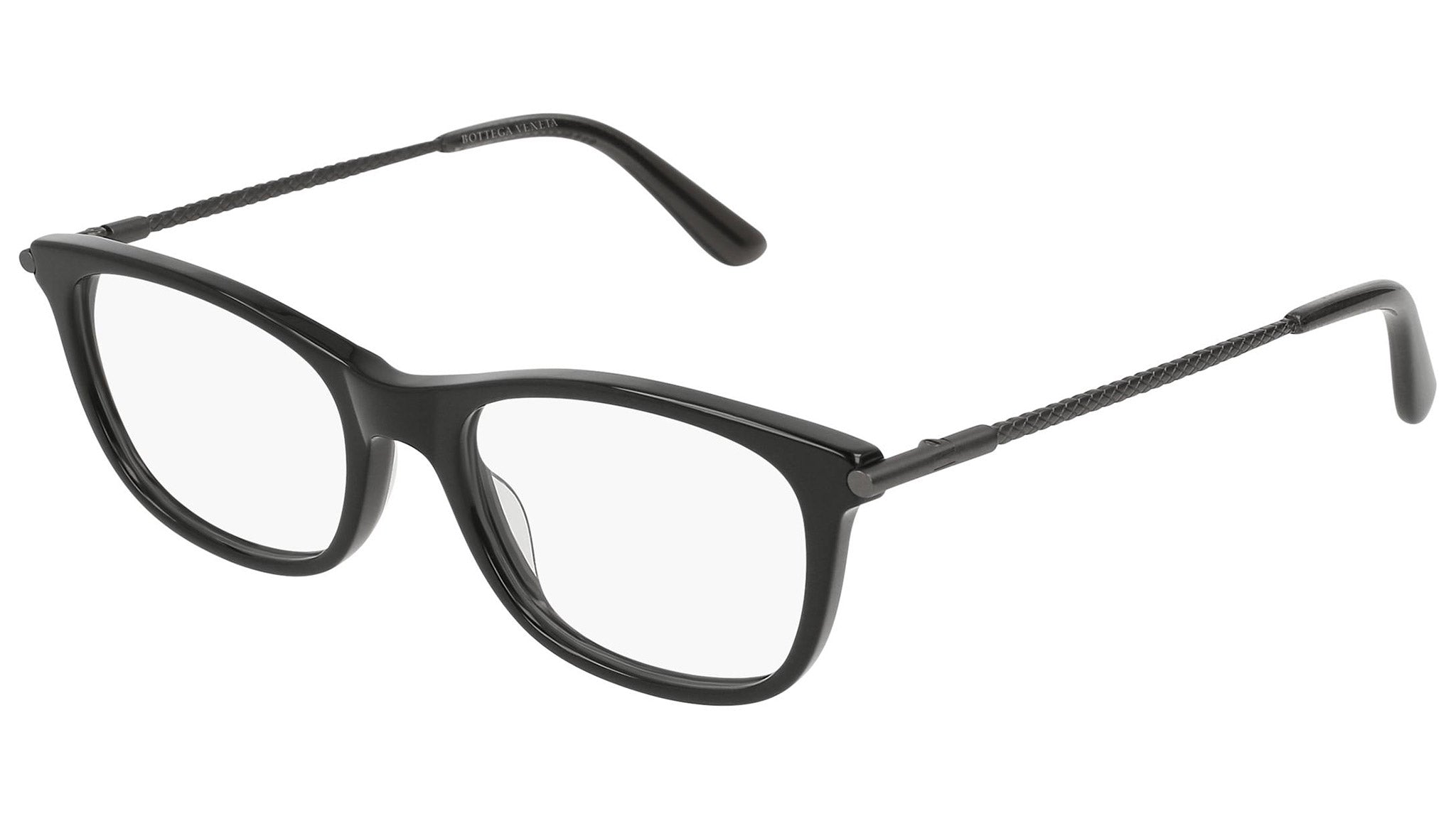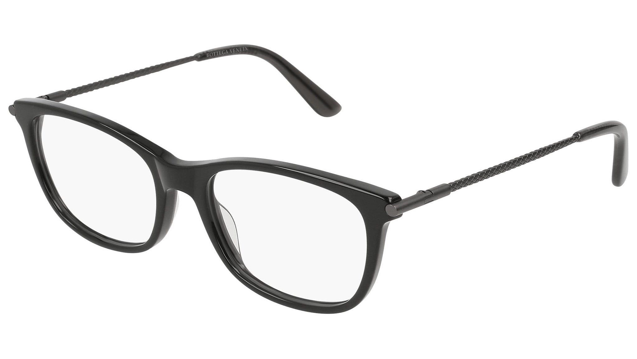 Occhiali da vista Bottega Veneta modello 0185O 001 featuring shiny black front frame and grey temple.