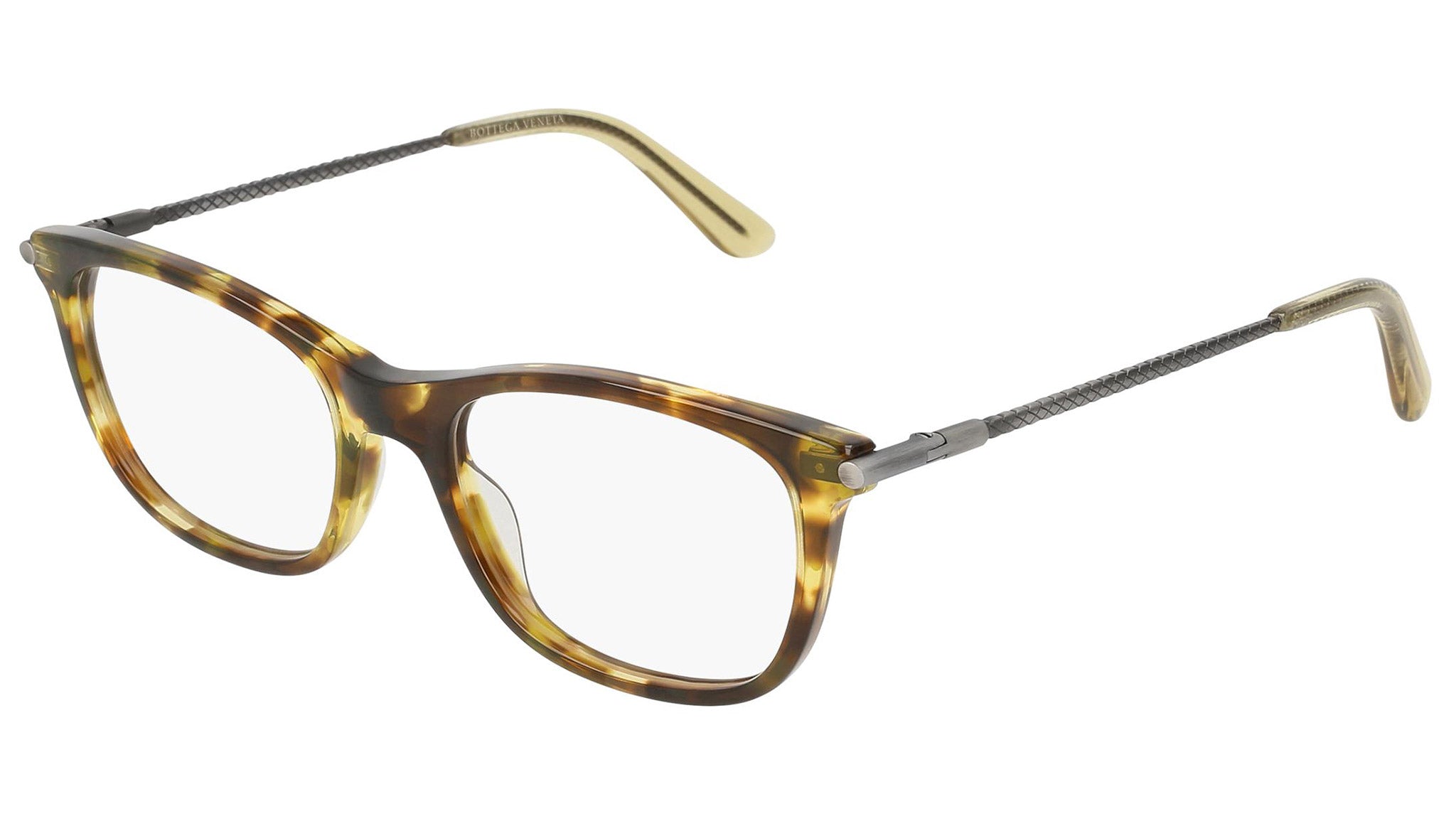 Occhiali da vista Bottega Veneta modello 0185O 004 featuring shiny green havana front frame and yellow temple.