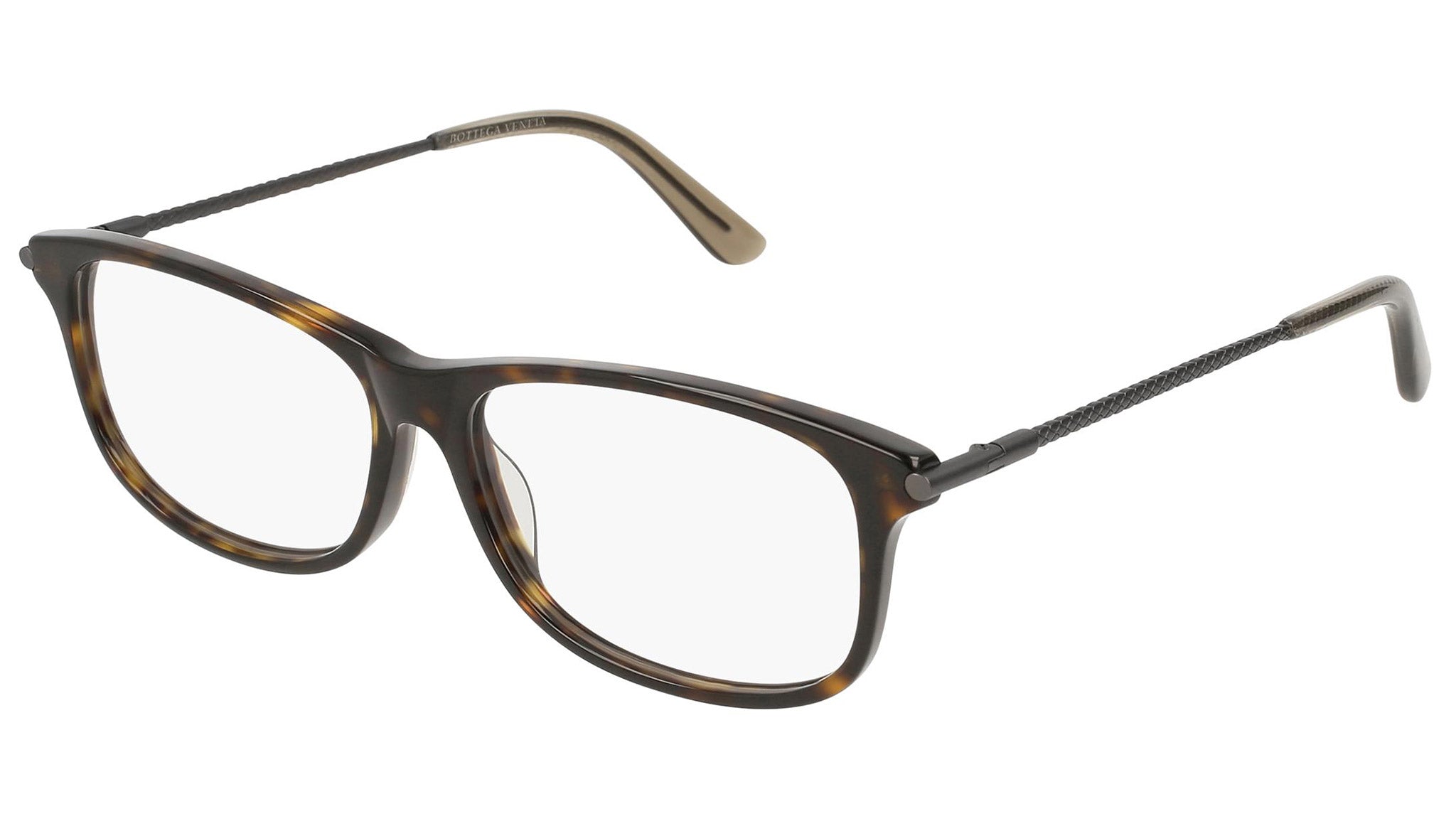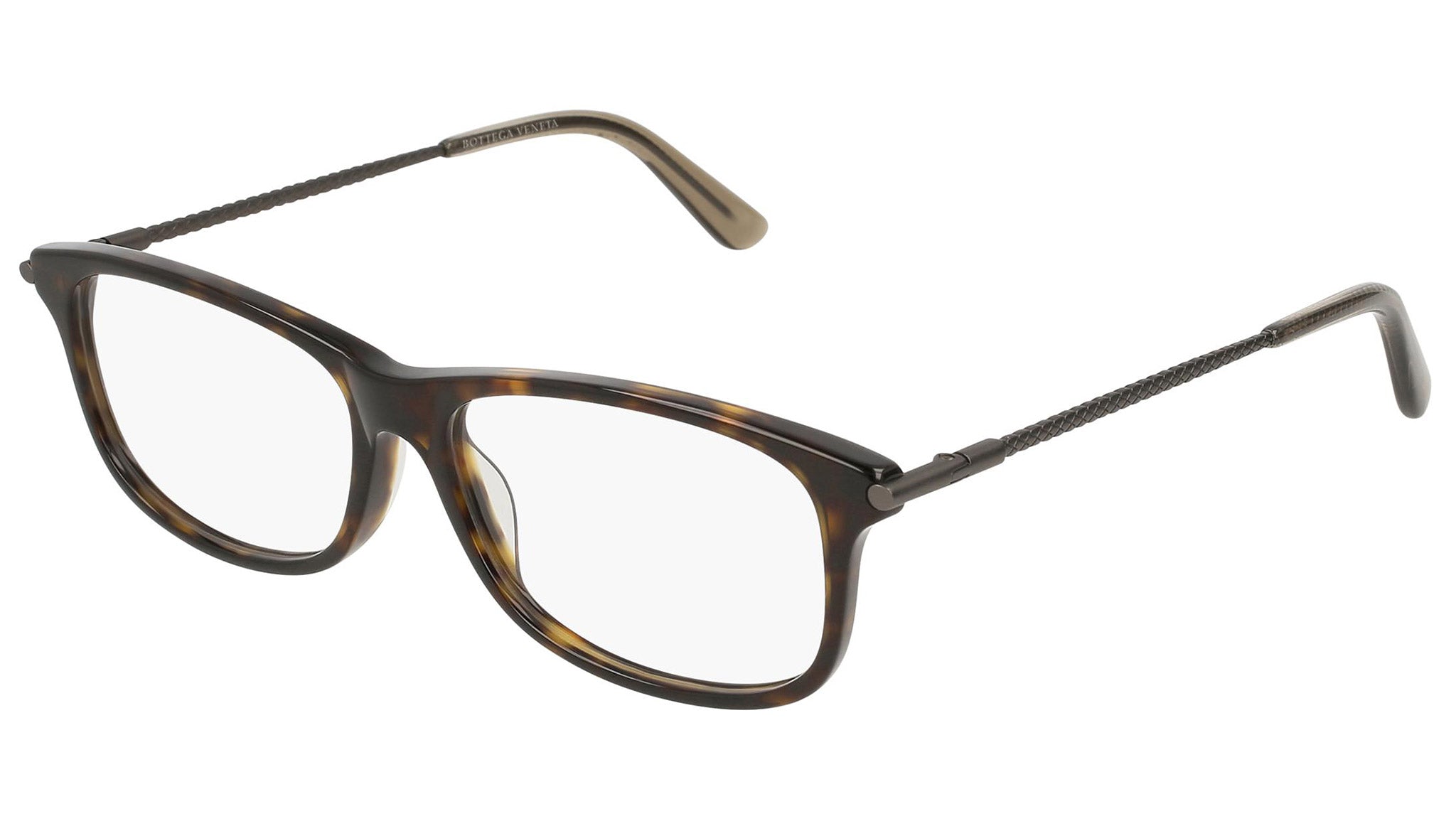 Occhiali da vista Bottega Veneta modello 0187O 002 featuring shiny dark havana front frame and ruthenium temple.