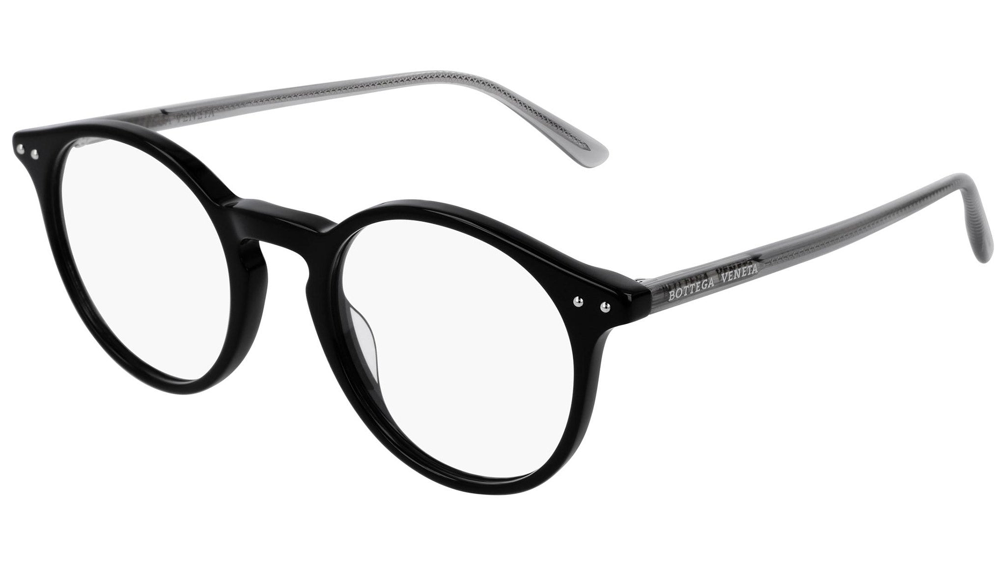 Occhiali da vista Bottega Veneta modello 0192O 001 featuring shiny black front frame and grey temple.