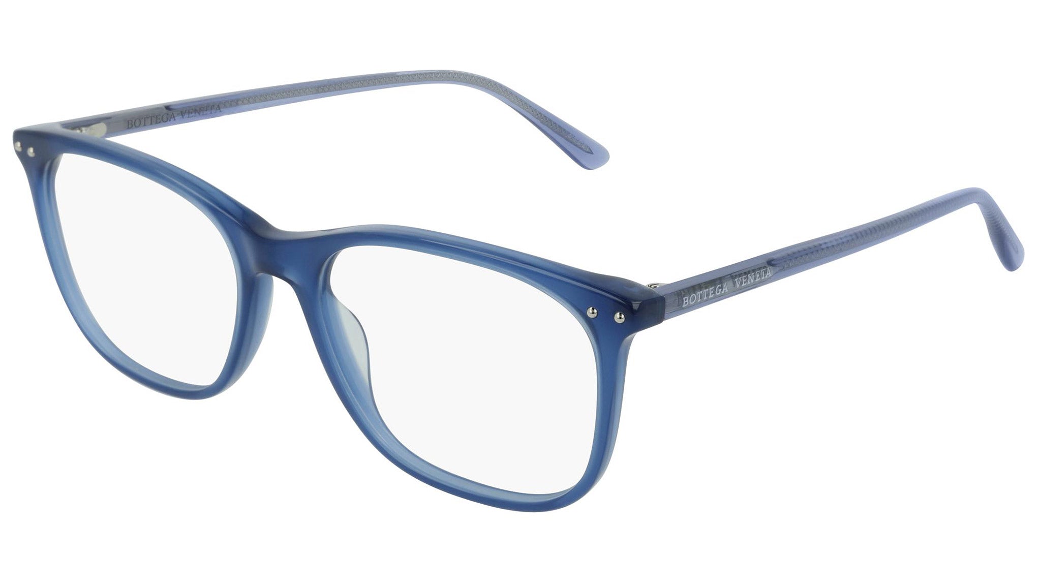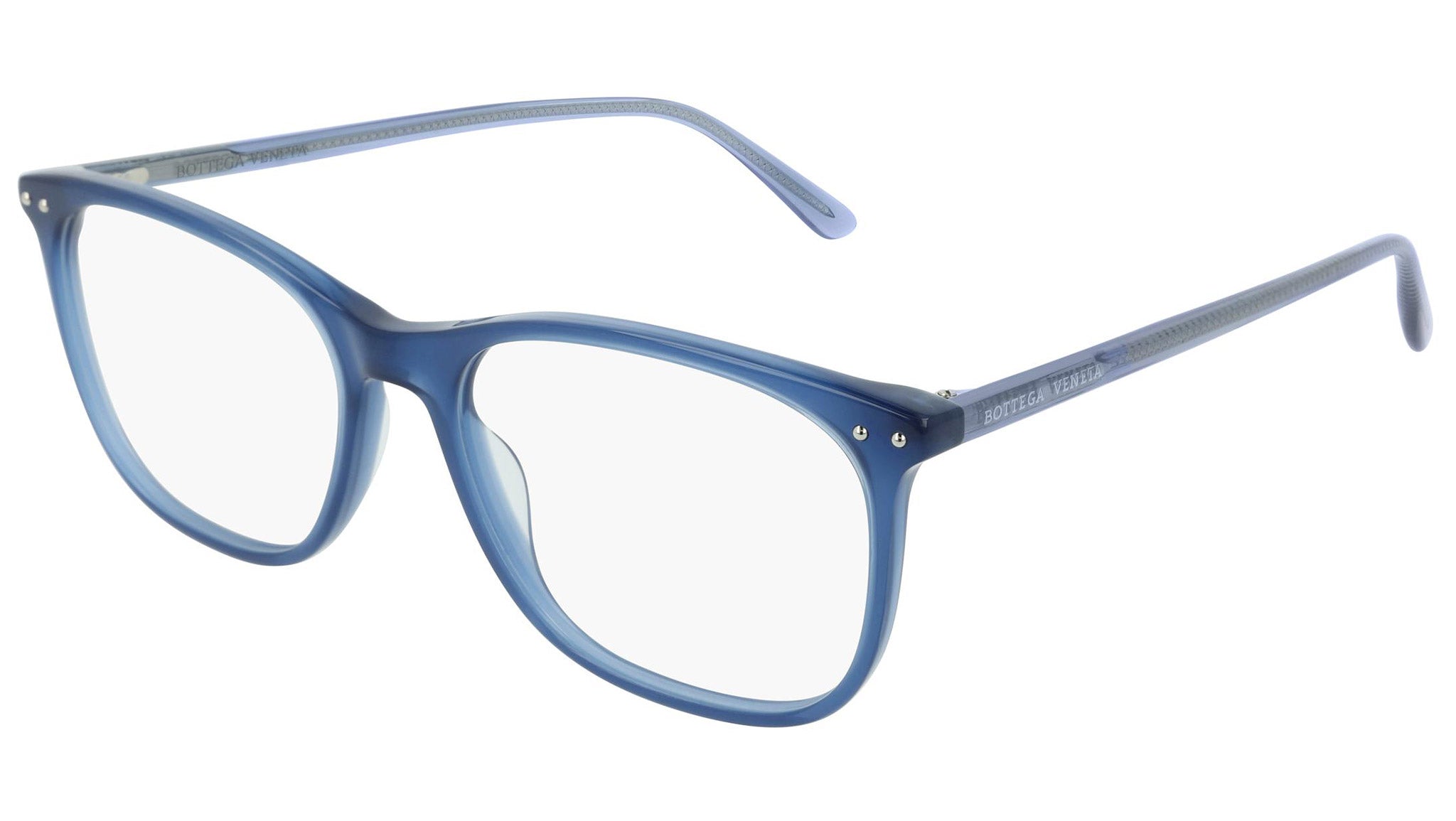 Occhiali da vista Bottega Veneta modello 0193O 003 featuring shiny opal petrol front frame and light-blue temple.