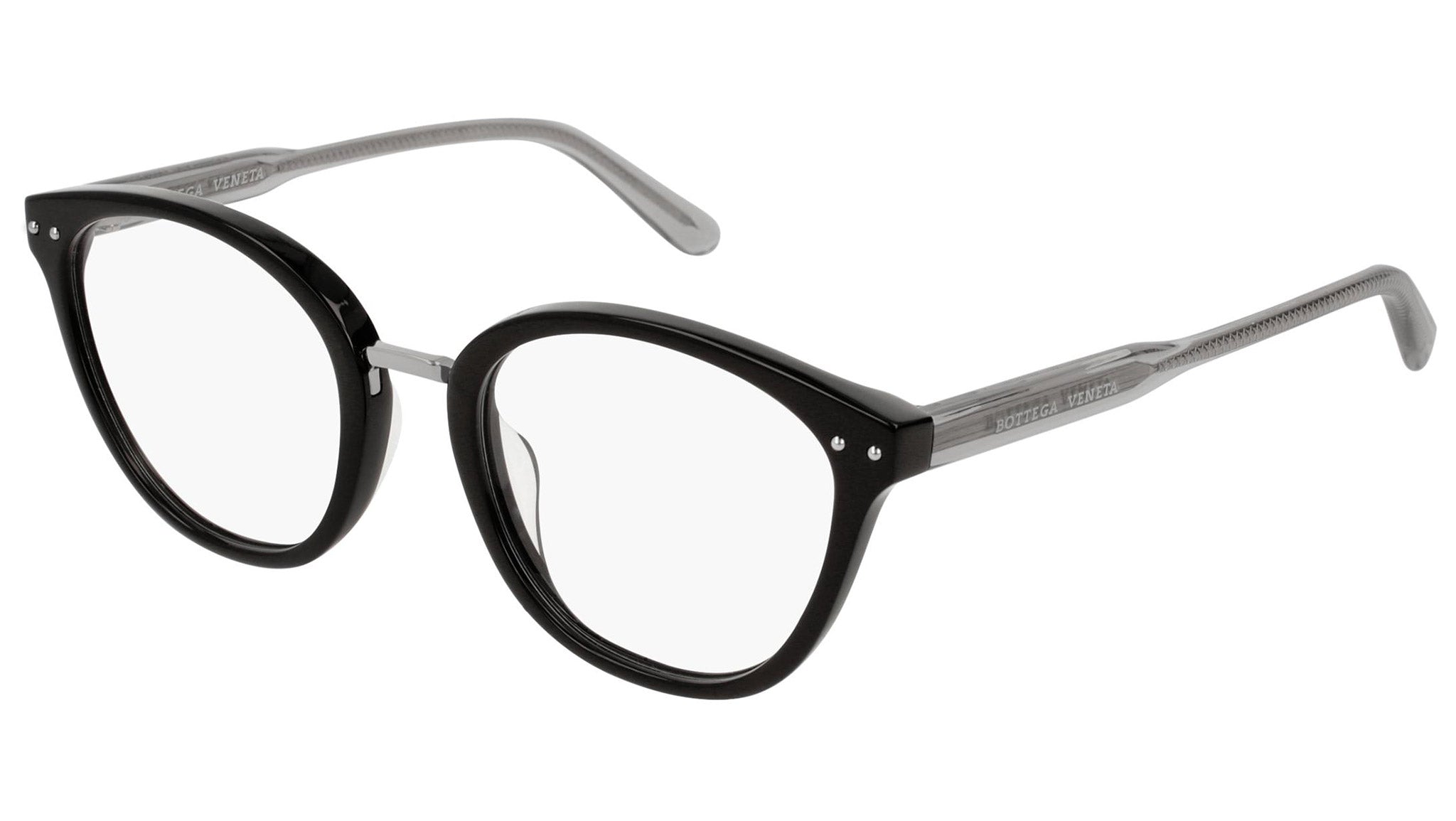 Occhiali da vista Bottega Veneta modello 0195O 001 featuring shiny black front frame and grey temple.