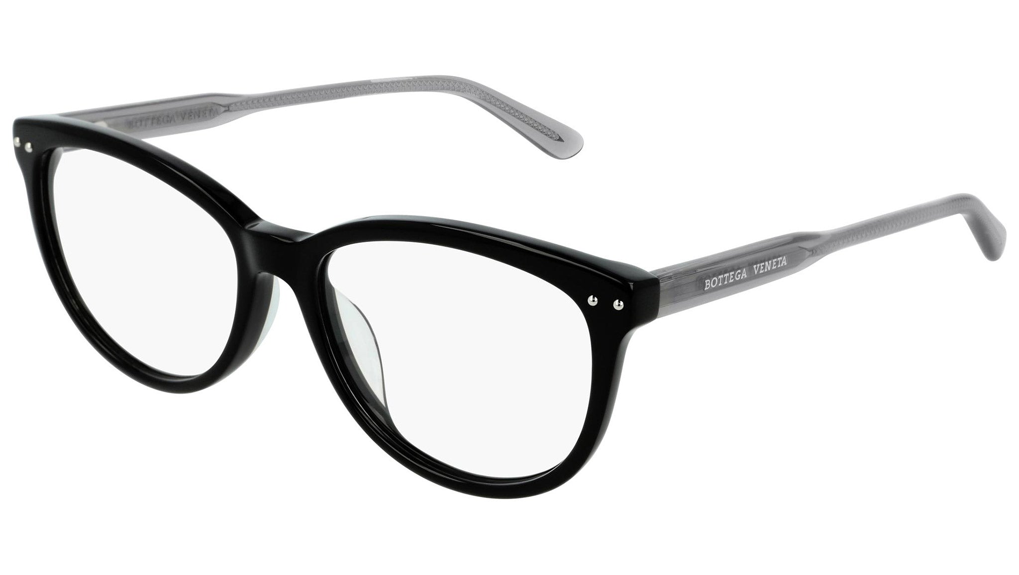 Occhiali da vista Bottega Veneta modello 0196O 001 featuring shiny black front frame and grey temple.