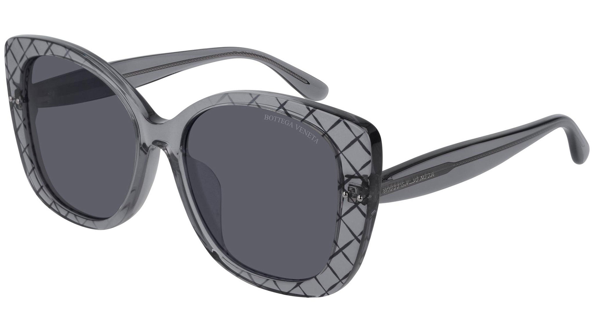 Bottega Veneta sunglasses collection model BV0198SA 001 featuring shiny transparent grey + serigraphy frame and solid grey lens. Inspired by Italian culture with a global outlook, the House is defined by a distinctly refined attitude. Bottega Veneta uses noble materials to create considered pieces that become part of their owner’s lives.