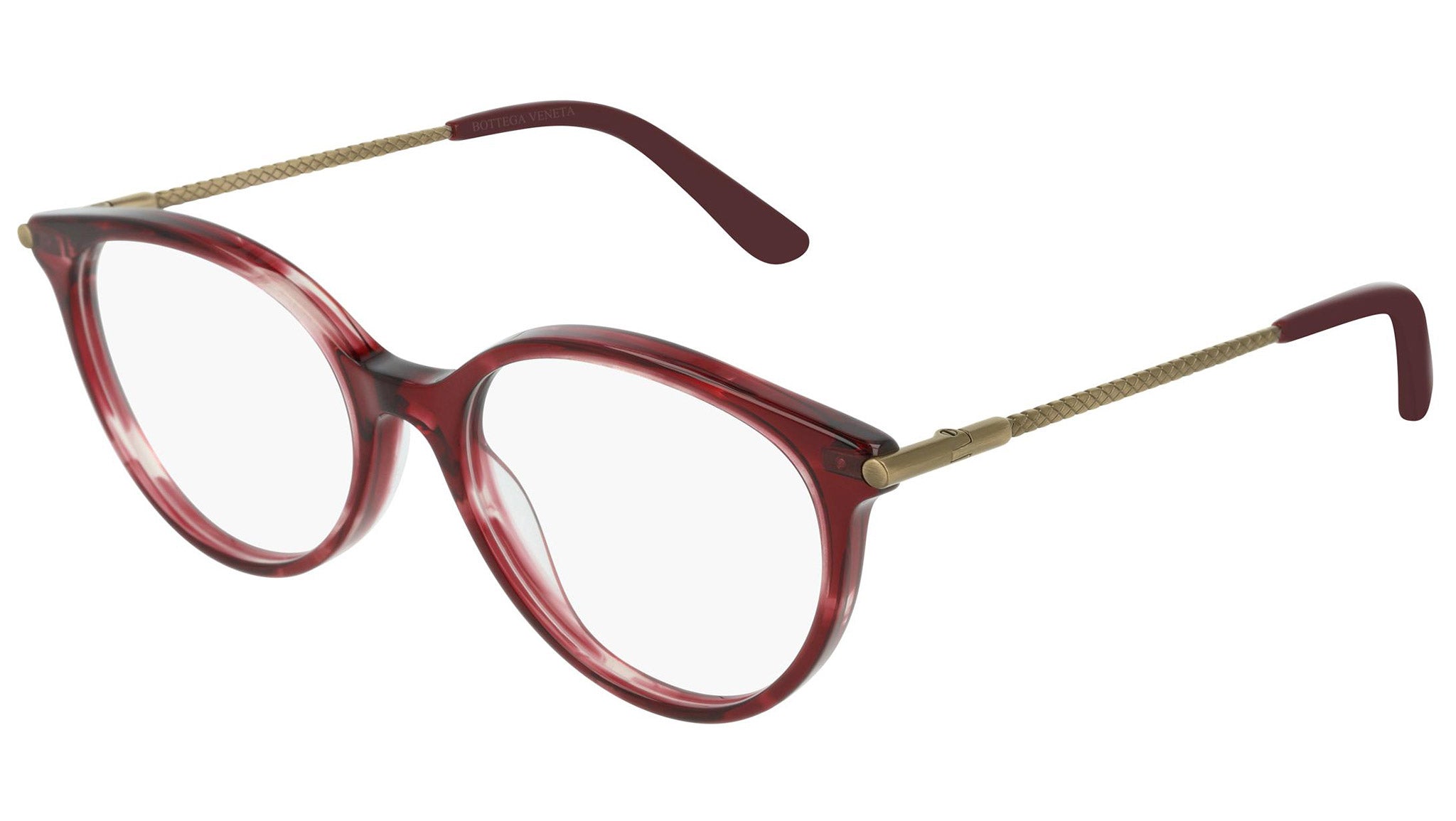 Occhiali da vista Bottega Veneta modello 0199O 003 featuring shiny melange cyclamen front frame and gold temple.