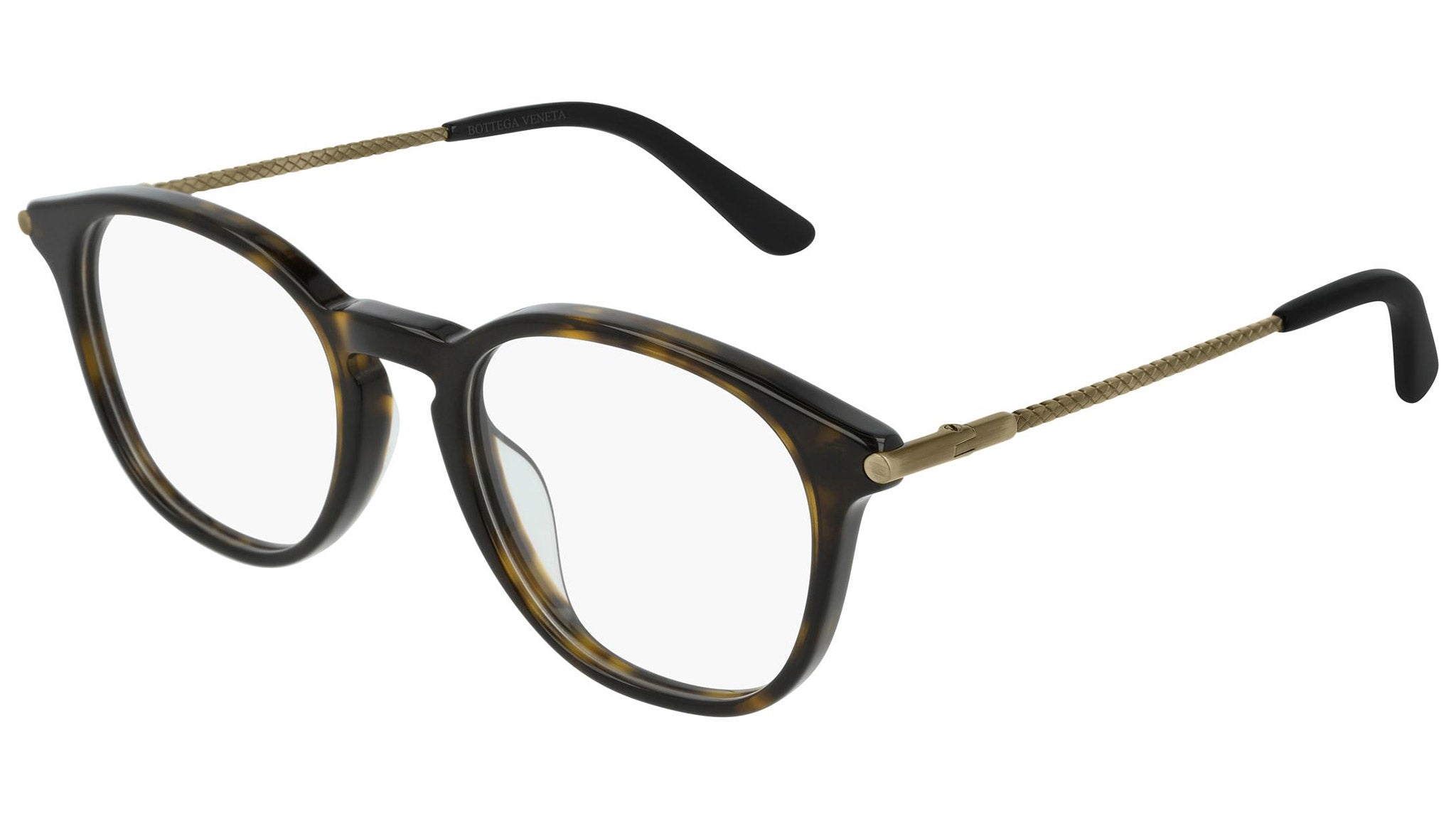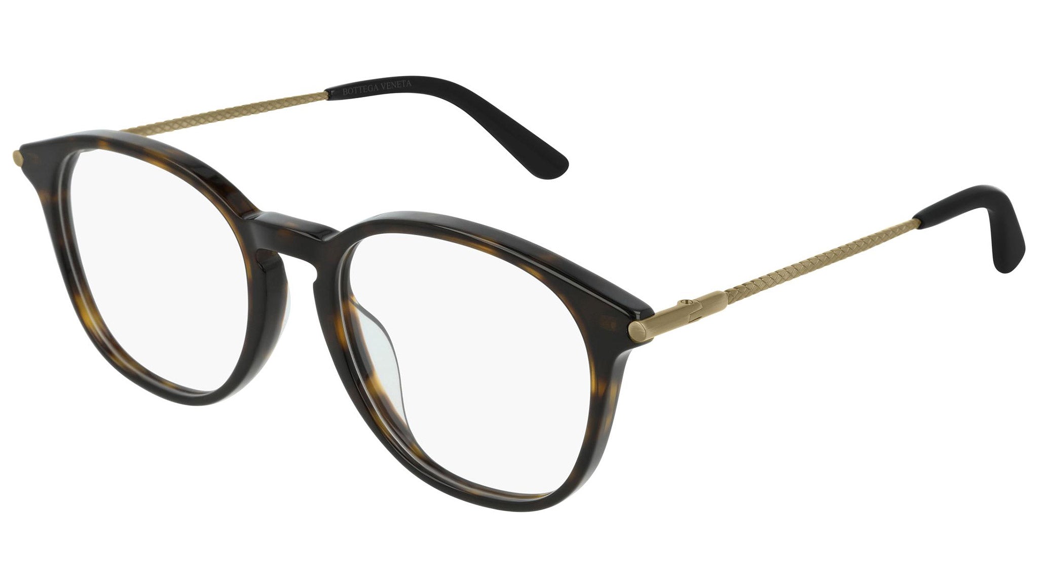 Occhiali da vista Bottega Veneta modello 0200O 002 featuring shiny dark havana front frame and gold temple.
