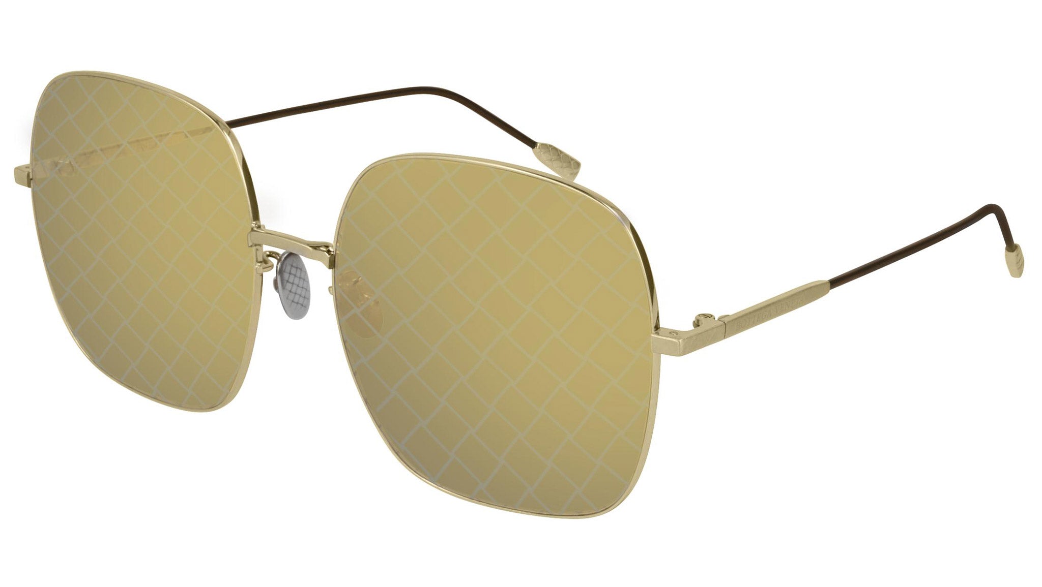 Bottega Veneta sunglasses collection model 0202S 003 featuring shiny cross brushed light gold front frame and solid brown and flash bronze intrecciato pattern lens. Inspired by Italian culture with a global outlook, the House is defined by a distinctly refined attitude. Bottega Veneta uses noble materials to create considered pieces that become part of their owner’s lives.