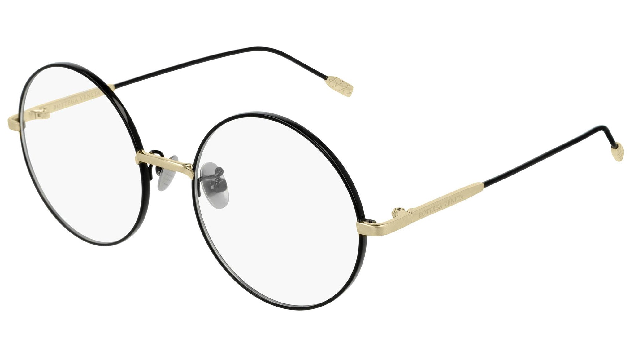 Occhiali da vista Bottega Veneta modello 0203O 001 featuring shiny solid varnished black and shiny cross brushed light gold front frame and black temple.