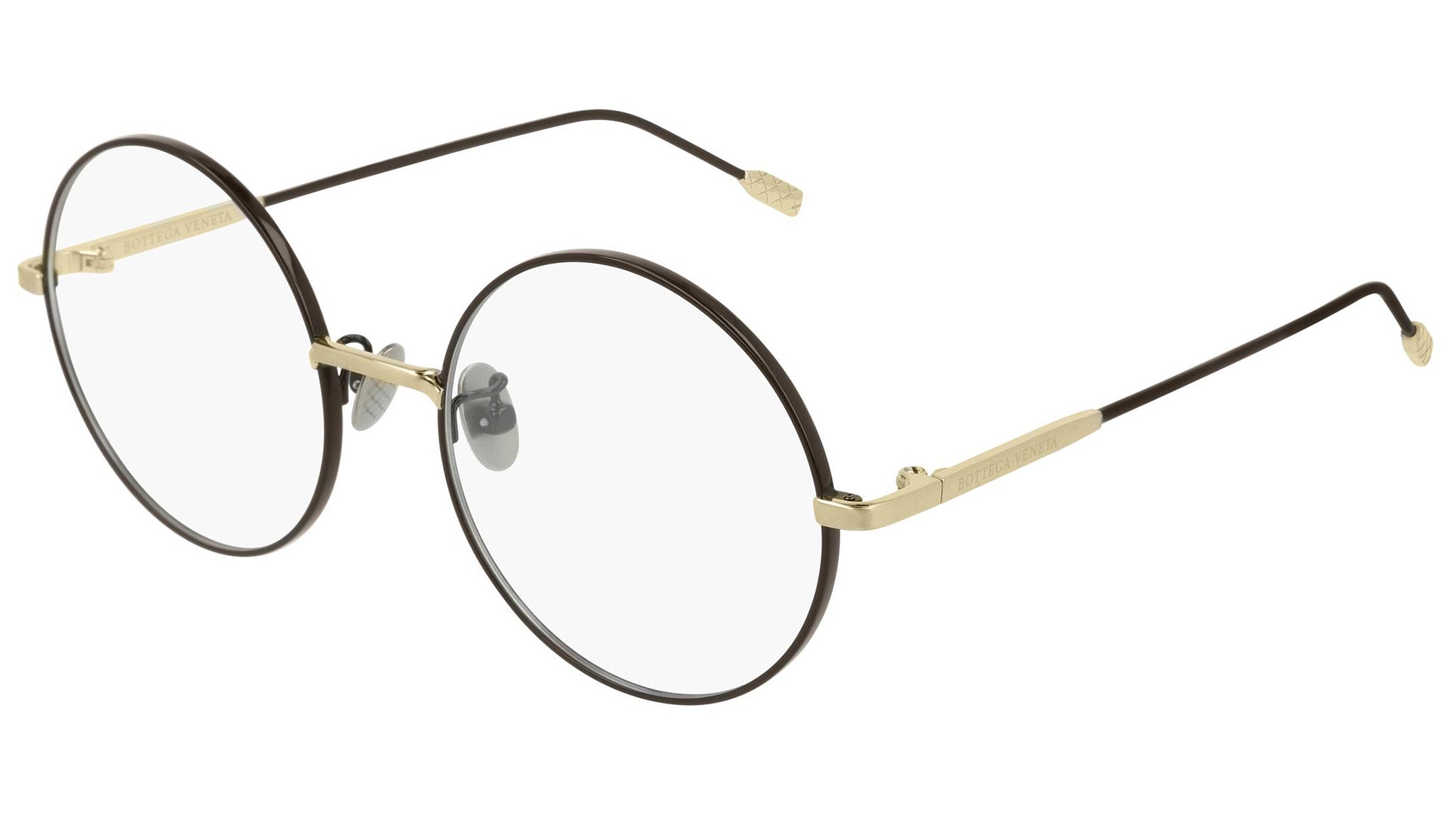 Occhiali da vista Bottega Veneta modello 0203O 002 featuring shiny solid varnished brown and shiny cross brushed light gold front frame and brown temple.