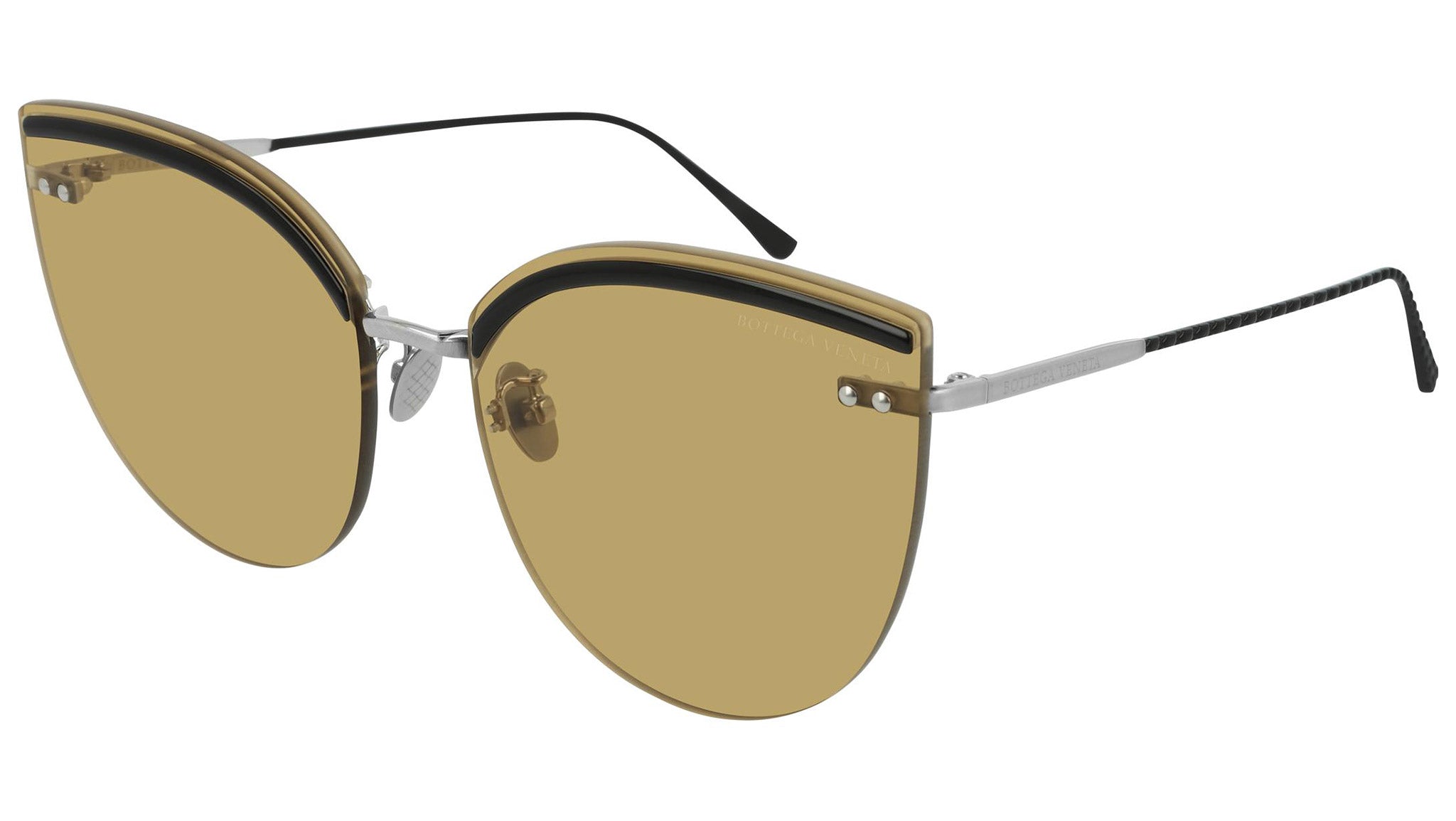 Bottega Veneta sunglasses collection model 0205S 002 featuring shiny black and shiny cross burnished silver front frame and solid ocher and violet inner AR lens. Inspired by Italian culture with a global outlook, the House is defined by a distinctly refined attitude. Bottega Veneta uses noble materials to create considered pieces that become part of their owner’s lives.