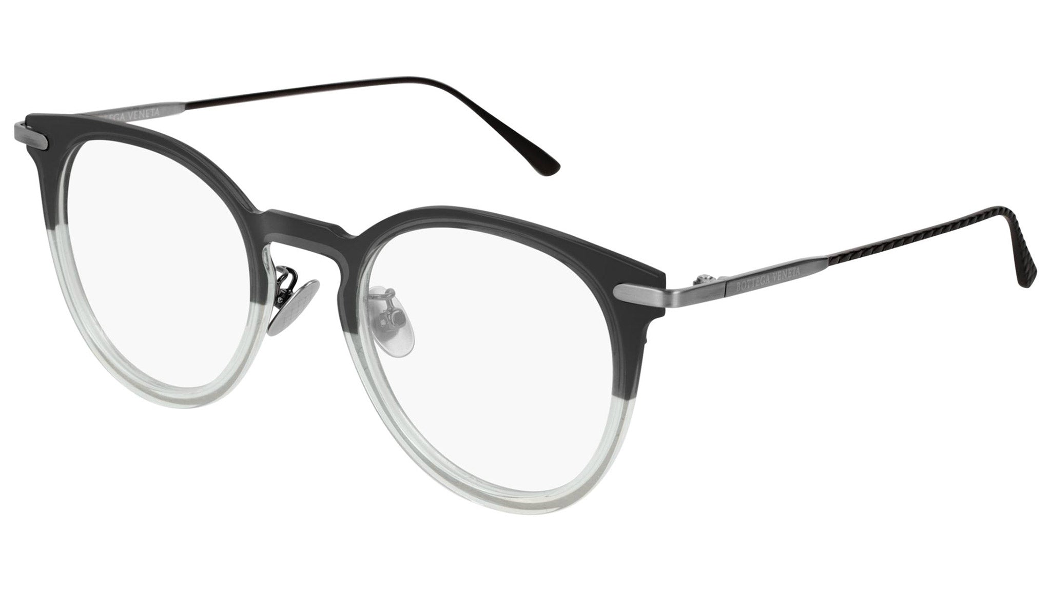 Occhiali da vista Bottega Veneta modello 0211O 001 featuring shiny transparent grey and shiny crystal front frame and black temple.