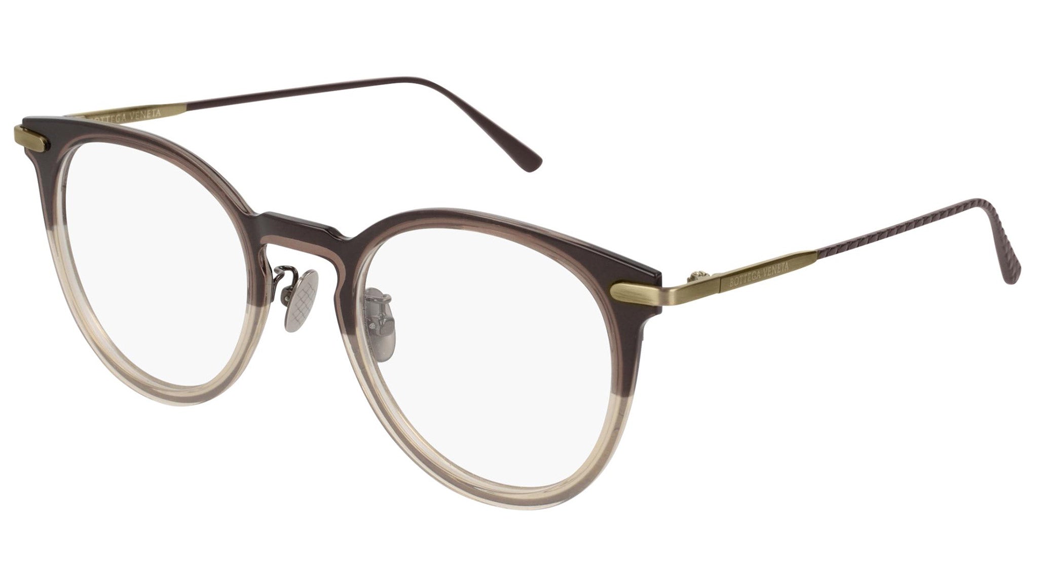 Occhiali da vista Bottega Veneta modello 0211O 002 featuring shiny transparent brown and shiny transparent light brown front frame and brown temple.