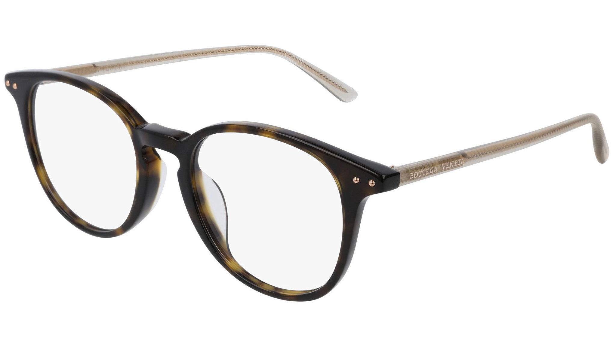 Occhiali da vista Bottega Veneta modello BV0216OA 003 featuring shiny dark havana frame and brown temple.