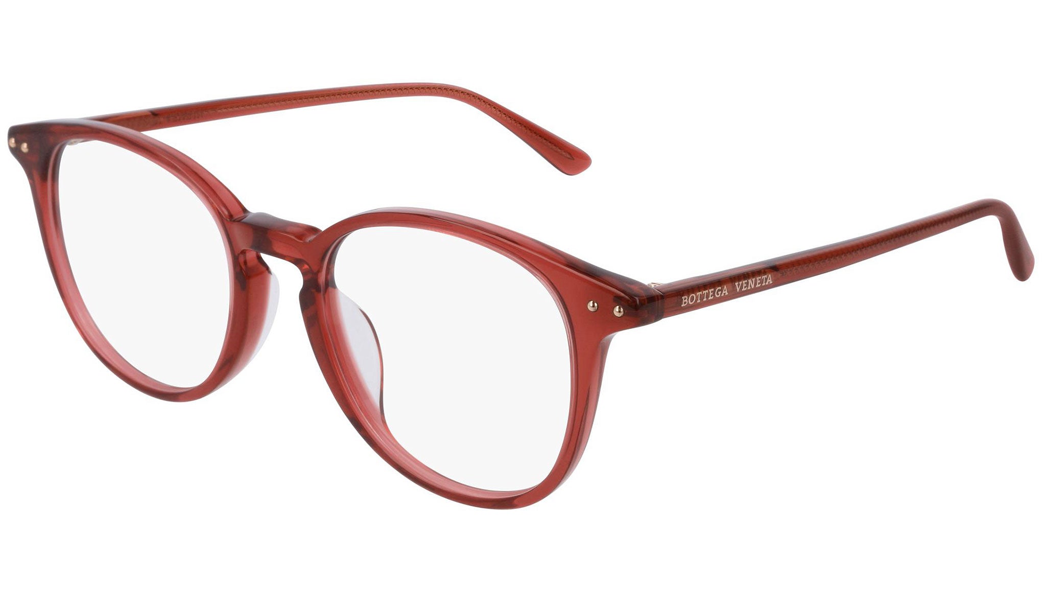 Occhiali da vista Bottega Veneta modello BV0216OA 004 featuring shiny opal cyclamen frame and red temple.