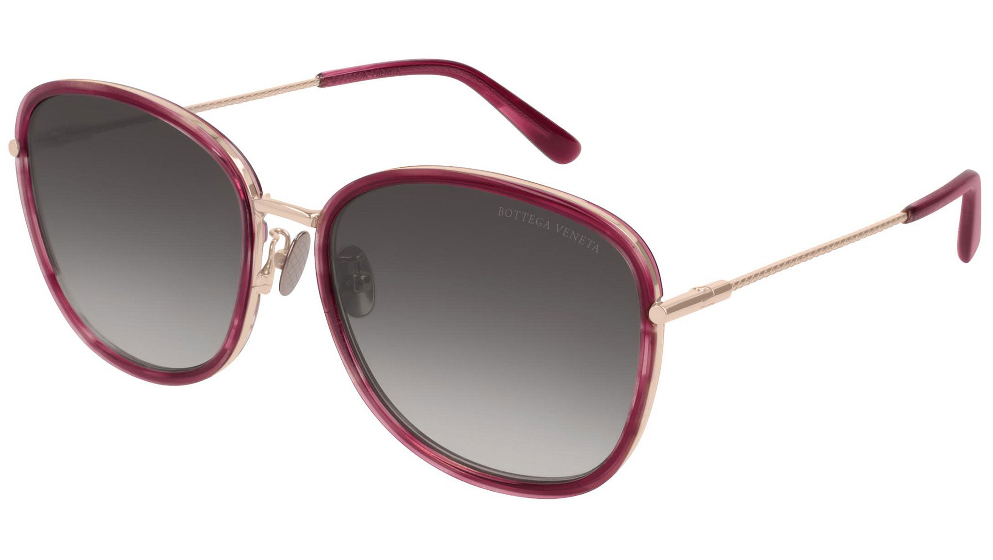 Bottega Veneta sunglasses collection model BV0220SK 004 featuring shiny melange cyclamen / shiny rose gold frame and gradient grey lens. Inspired by Italian culture with a global outlook, the House is defined by a distinctly refined attitude. Bottega Veneta uses noble materials to create considered pieces that become part of their owner’s lives.
