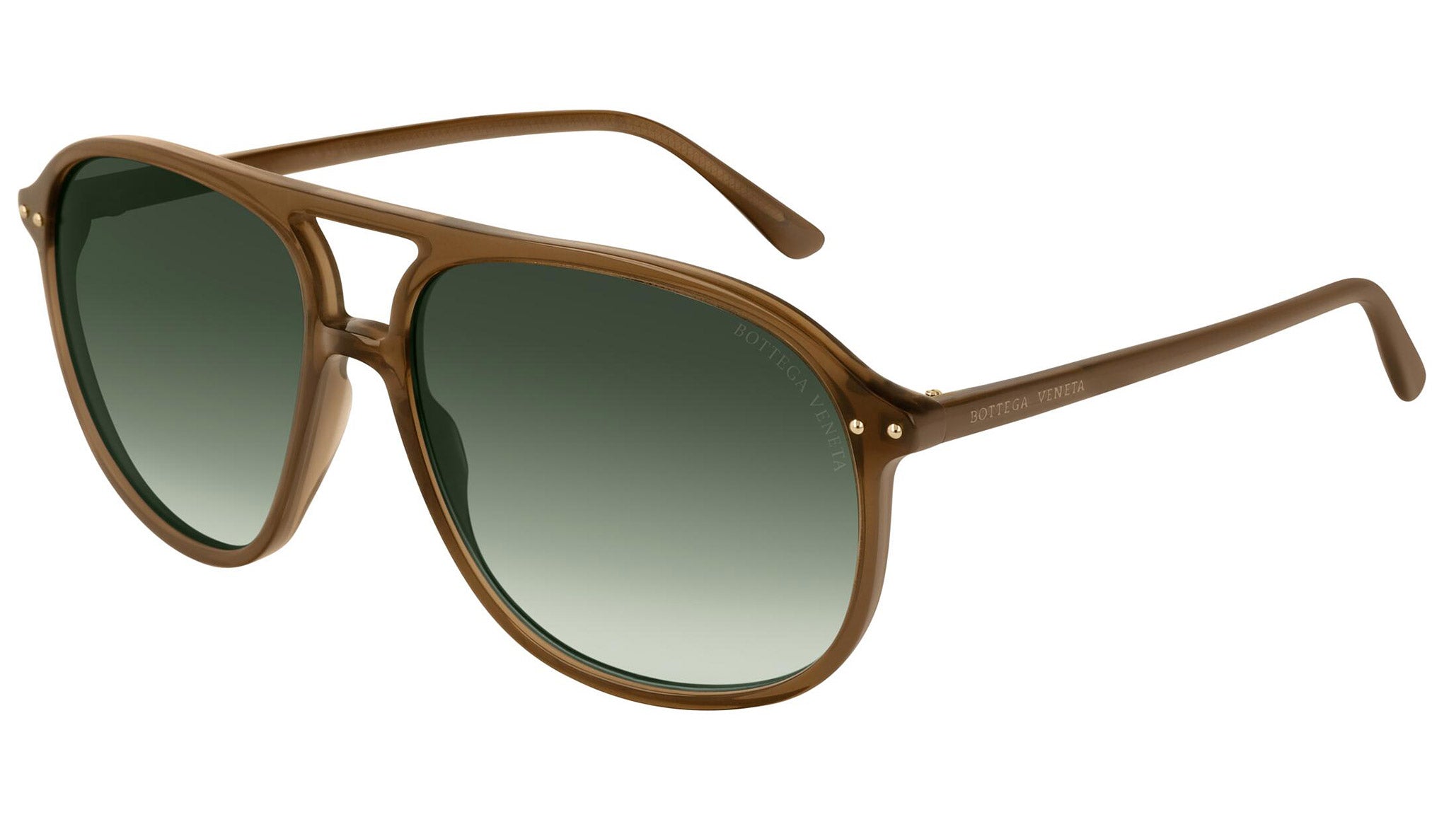Bottega Veneta sunglasses collection model 0224S 004 featuring shiny transparent brown front frame and gradient green lens. Inspired by Italian culture with a global outlook, the House is defined by a distinctly refined attitude. Bottega Veneta uses noble materials to create considered pieces that become part of their owner’s lives.
