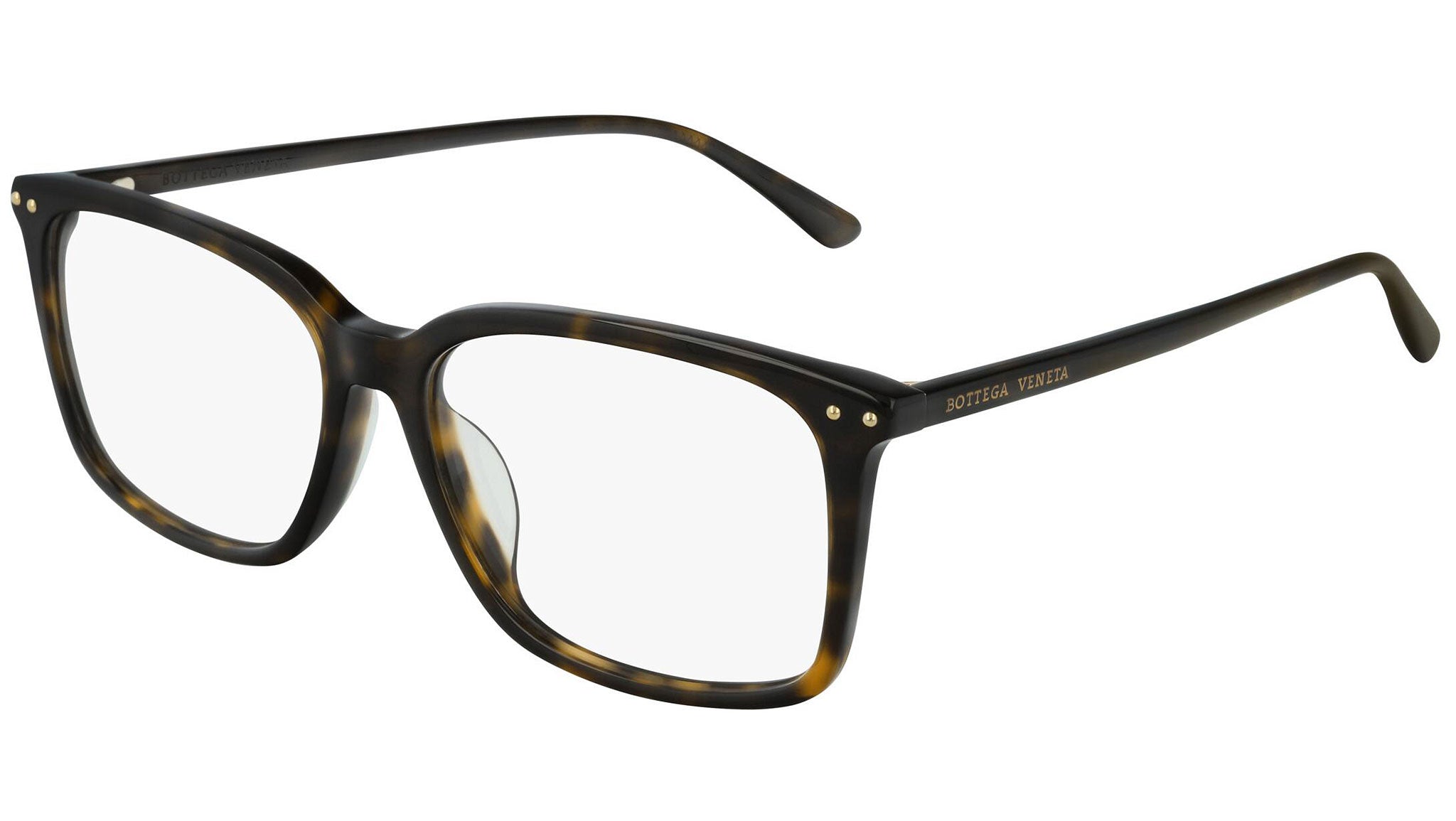 Occhiali da vista Bottega Veneta modello BV0227OA 002 featuring shiny dark havana frame and havana temple.