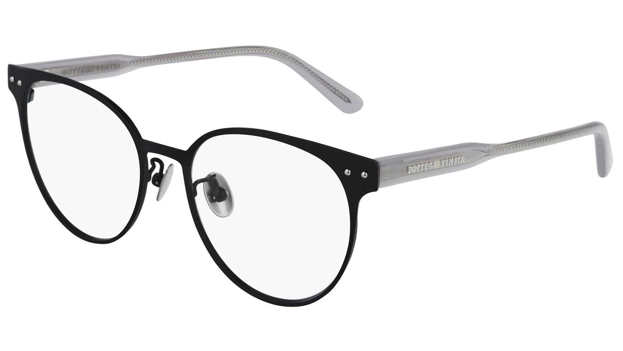 Occhiali da vista Bottega Veneta modello 0228O 001 featuring semimatte black front frame and grey temple.