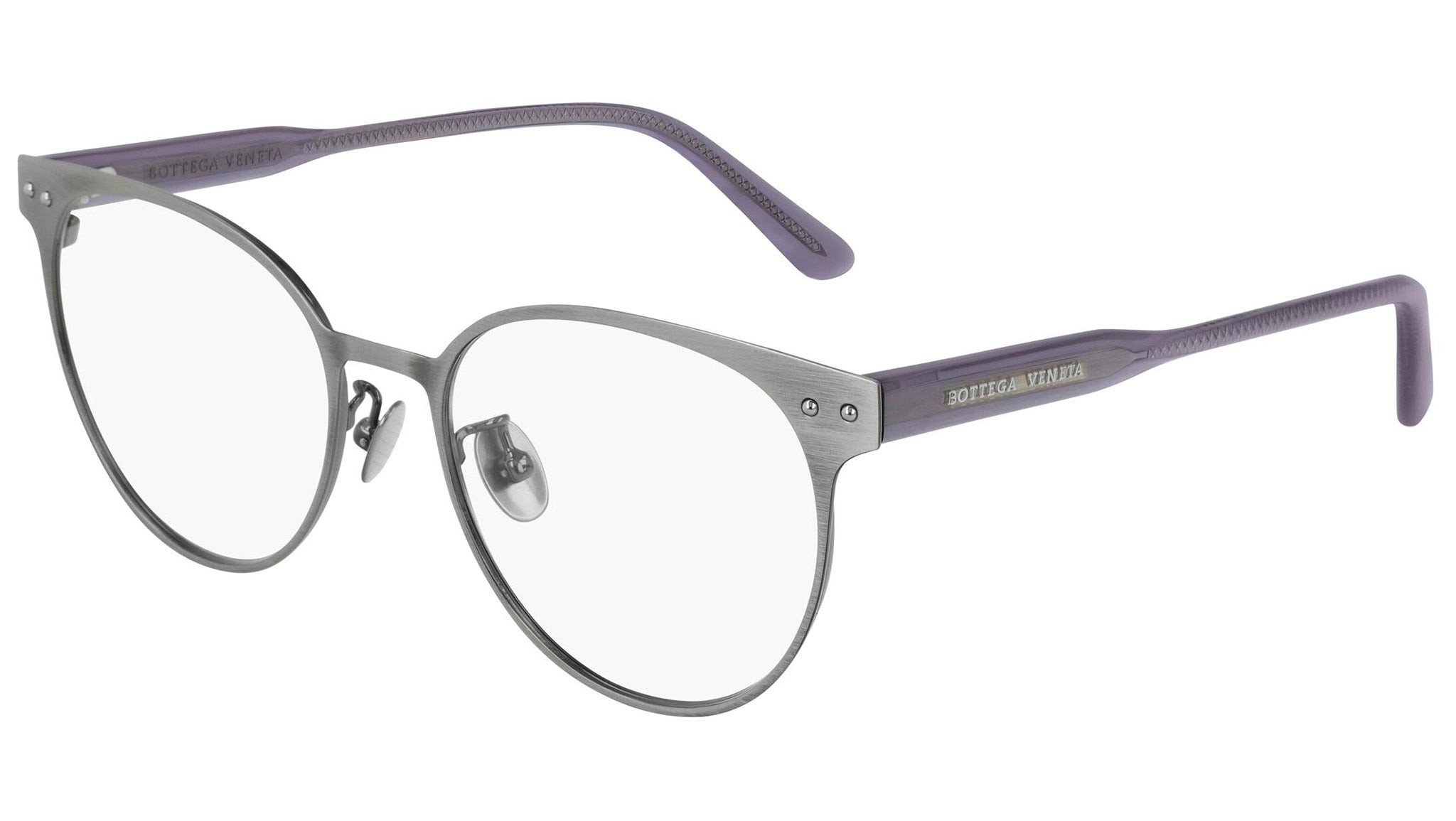 Occhiali da vista Bottega Veneta modello 0228O 002 featuring semimatte antique silver front frame and violet temple.