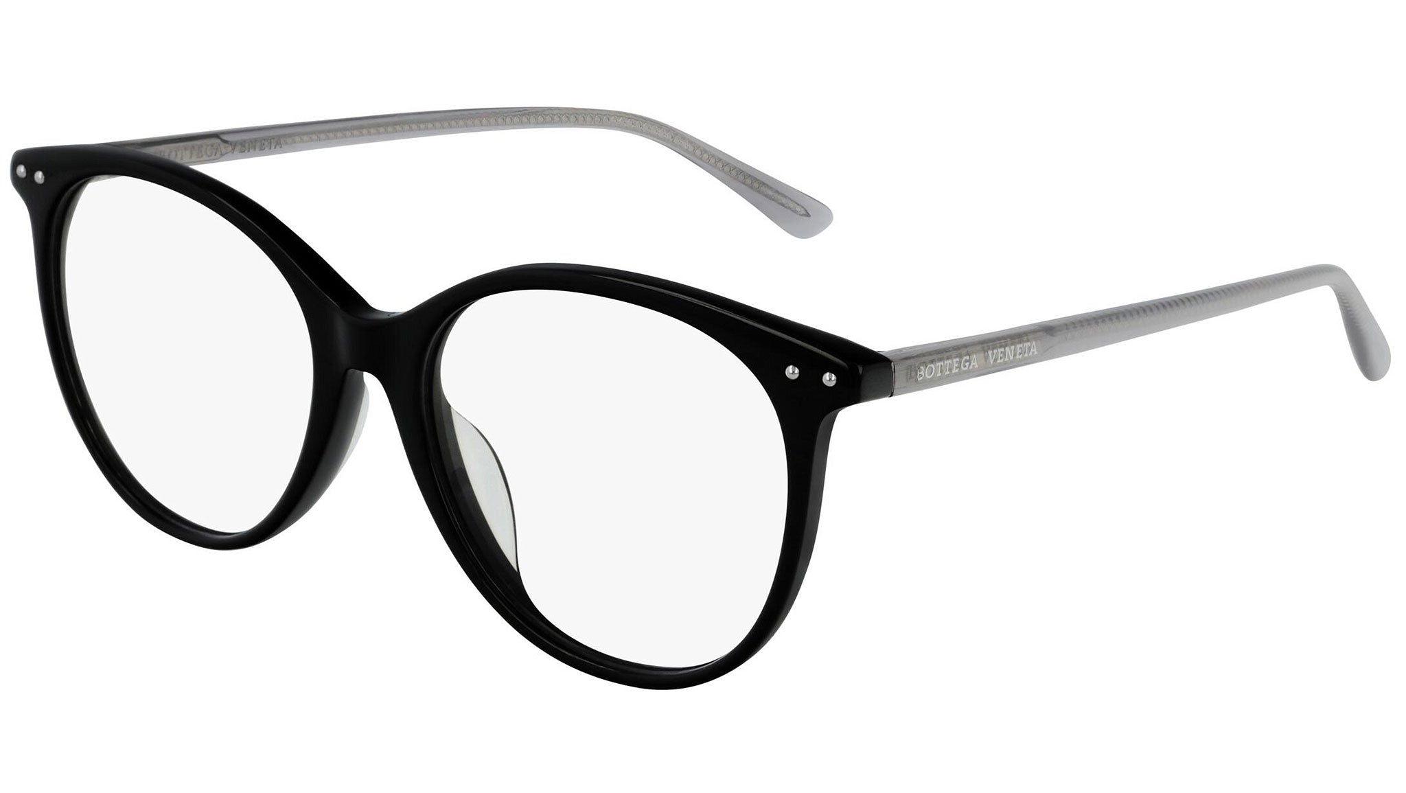 Occhiali da vista Bottega Veneta modello BV0229OA 001 featuring shiny black frame and grey temple.