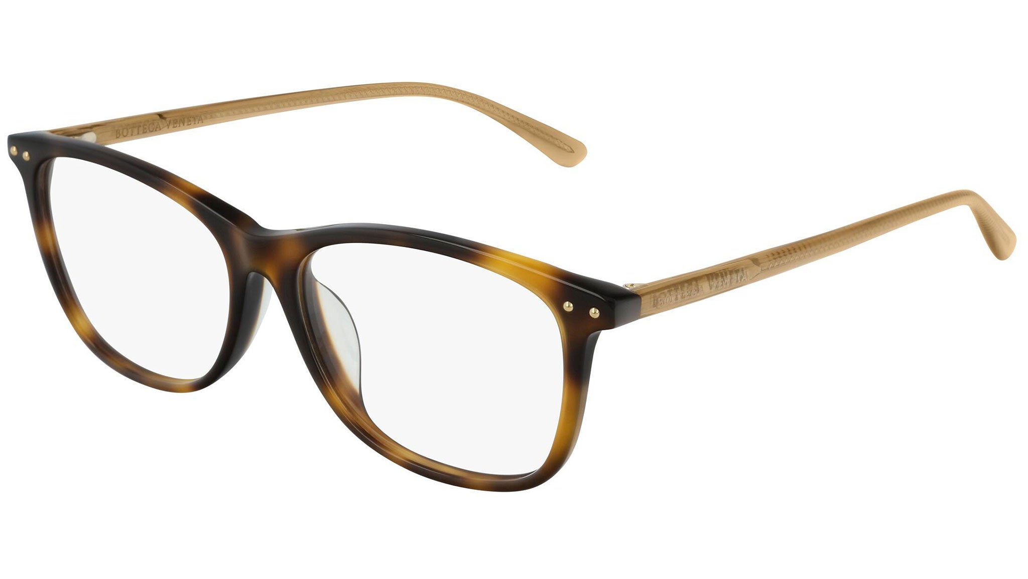 Occhiali da vista Bottega Veneta modello BV0230OA 002 featuring shiny medium havana frame and yellow temple.