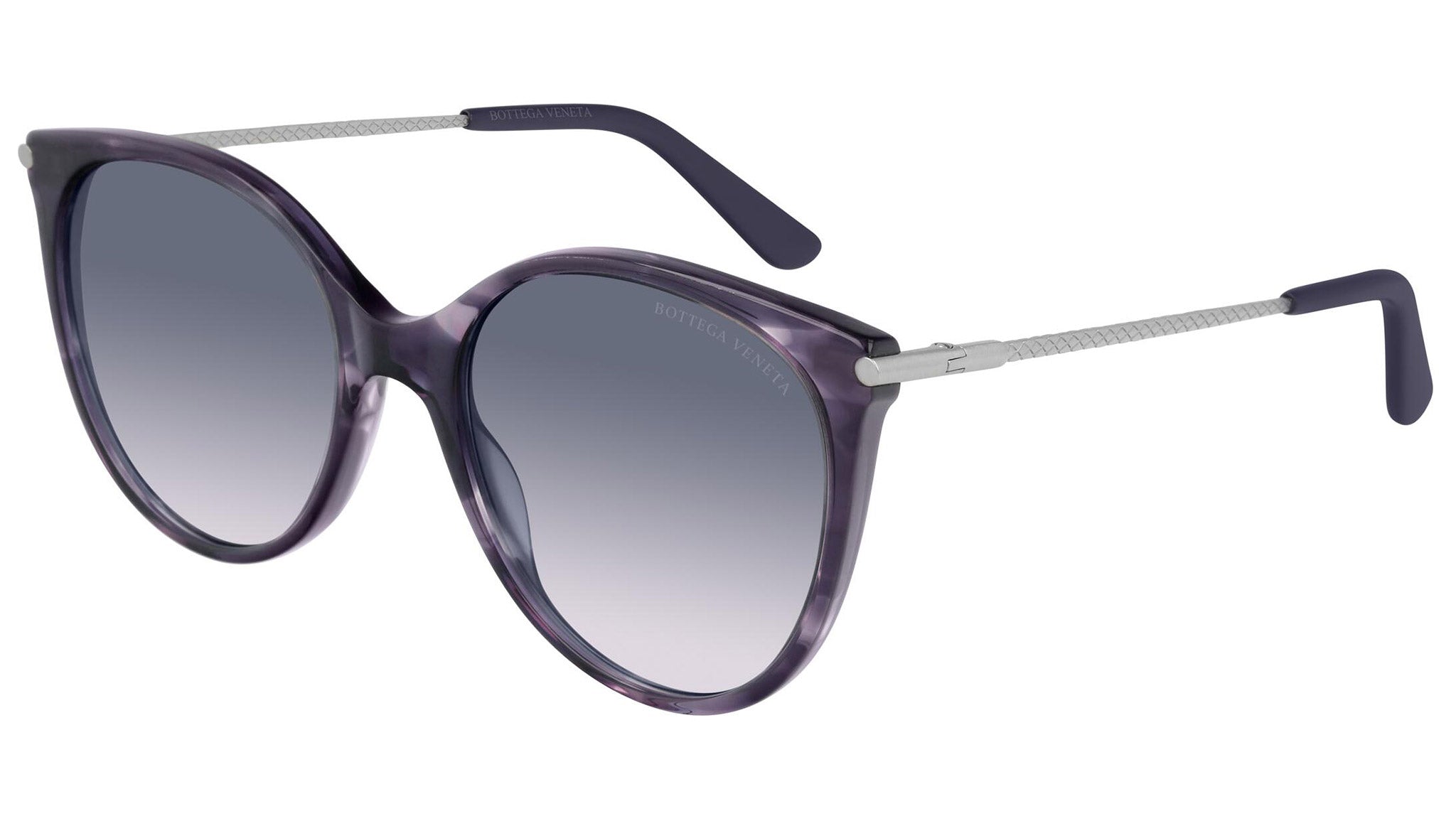 Bottega Veneta sunglasses collection model 0231S 004 featuring shiny melange violet front frame and gradient blue lens. Inspired by Italian culture with a global outlook, the House is defined by a distinctly refined attitude. Bottega Veneta uses noble materials to create considered pieces that become part of their owner’s lives.