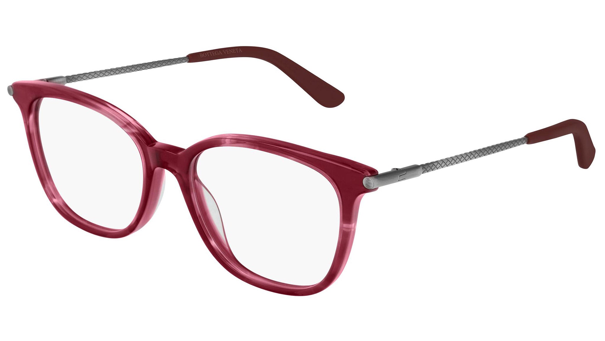 Occhiali da vista Bottega Veneta modello 0232O 003 featuring shiny melange cyclamen front frame and silver temple.
