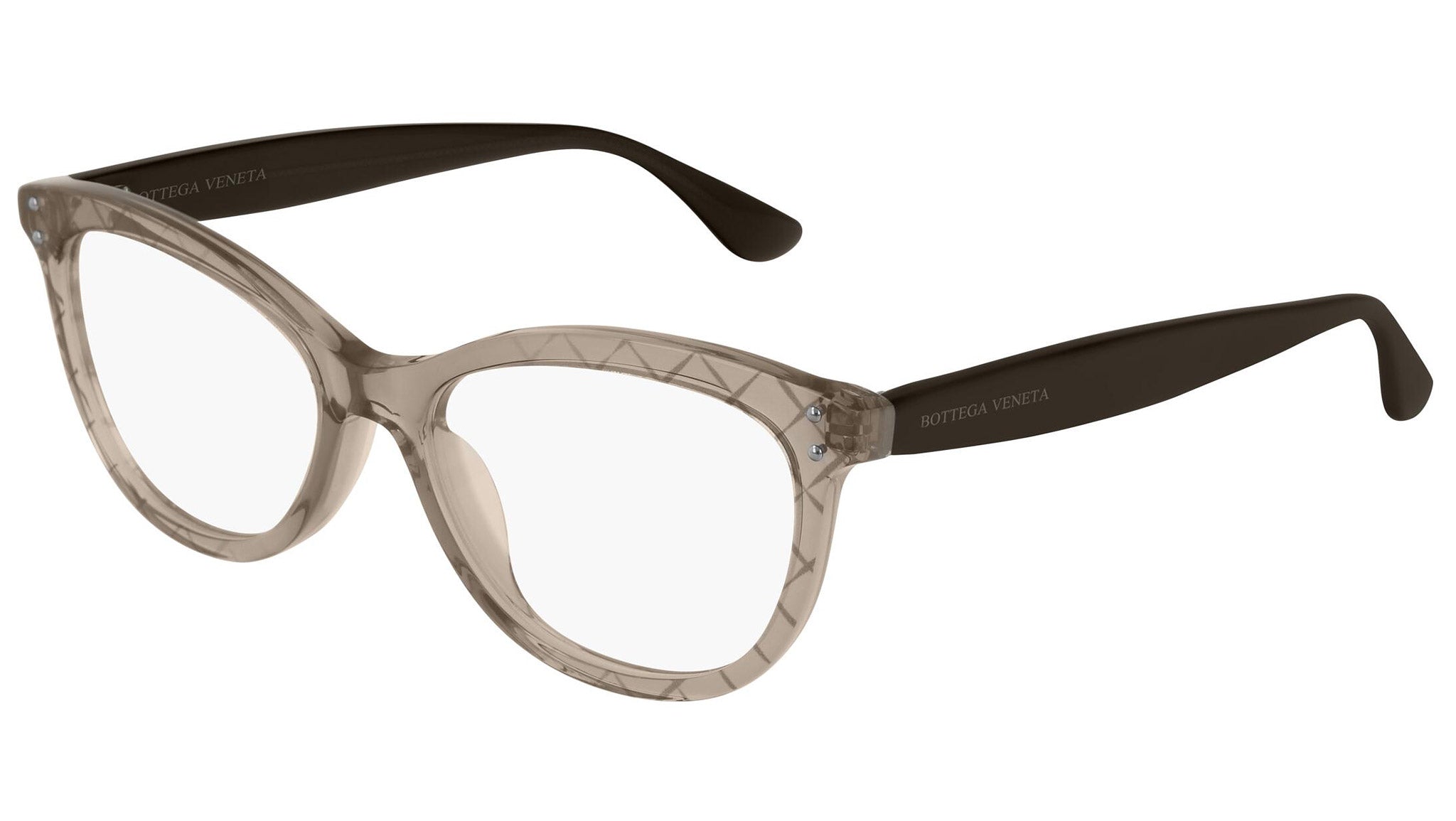 Occhiali da vista Bottega Veneta modello 0235O 002 featuring shiny transparent brown + serigraphy front frame and brown temple.
