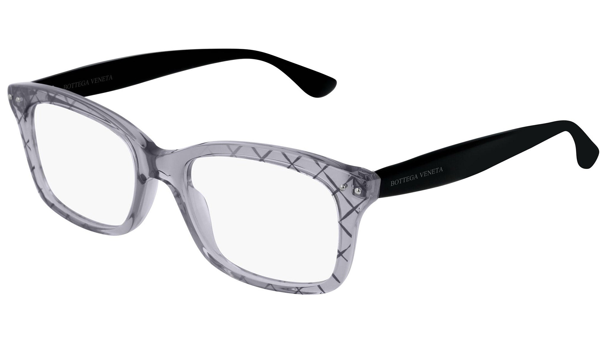Occhiali da vista Bottega Veneta modello 0236O 001 featuring shiny transparent grey + serigraphy front frame and black temple.