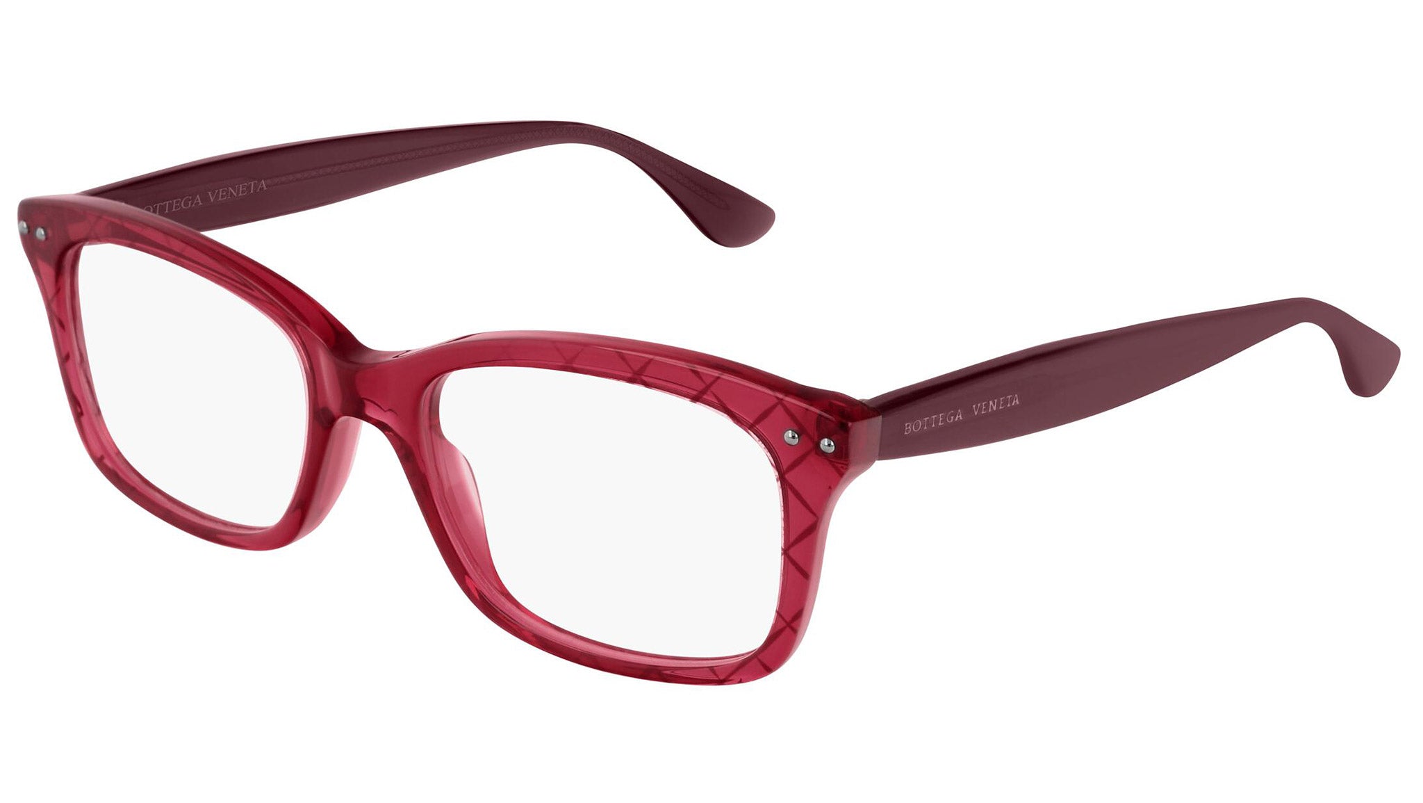 Occhiali da vista Bottega Veneta modello 0236O 004 featuring shiny transparent fuxia + serigraphy front frame and violet temple.