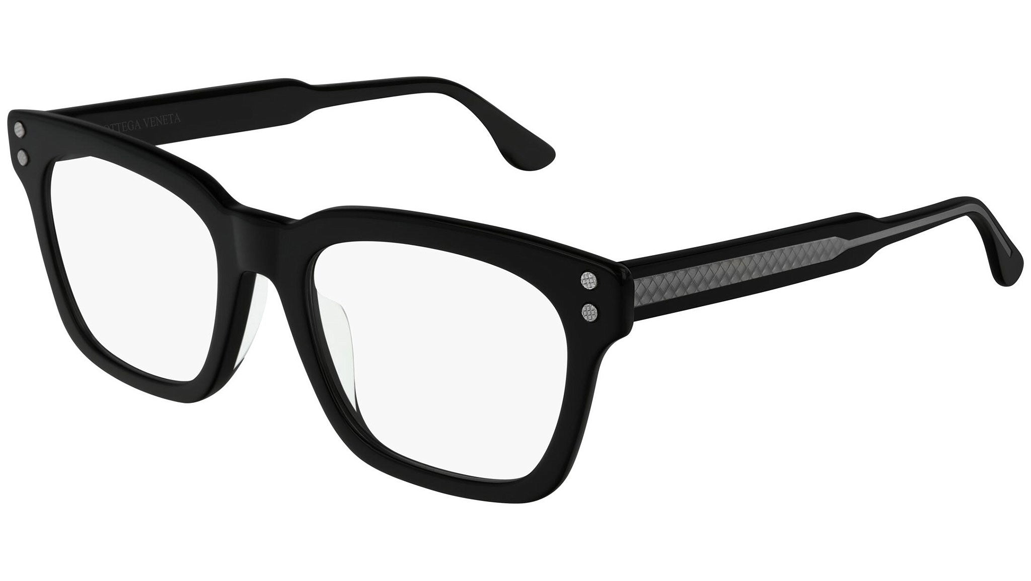 Occhiali da vista Bottega Veneta modello BV0240OA 001 featuring shiny black frame and grey temple.