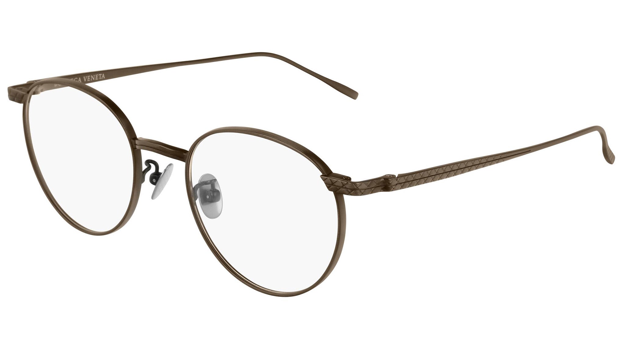 Occhiali da vista Bottega Veneta modello 0249O 003 featuring semimatte antique brass SJI front frame and bronze temple.