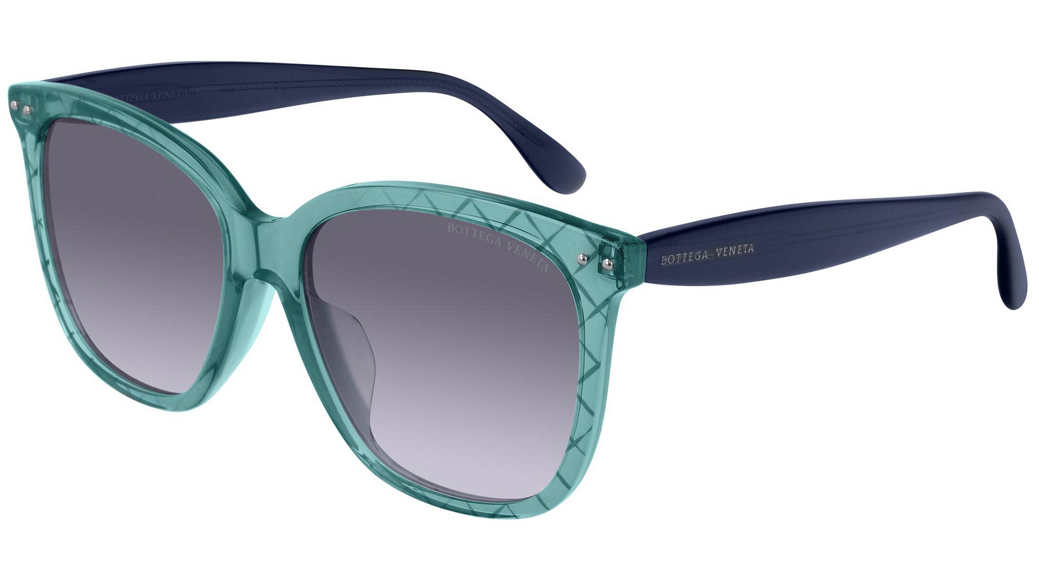 Bottega Veneta sunglasses collection model BV0252SA 004 featuring shiny transparent teal + serigraphy frame and gradient blue lens. Inspired by Italian culture with a global outlook, the House is defined by a distinctly refined attitude. Bottega Veneta uses noble materials to create considered pieces that become part of their owner’s lives.