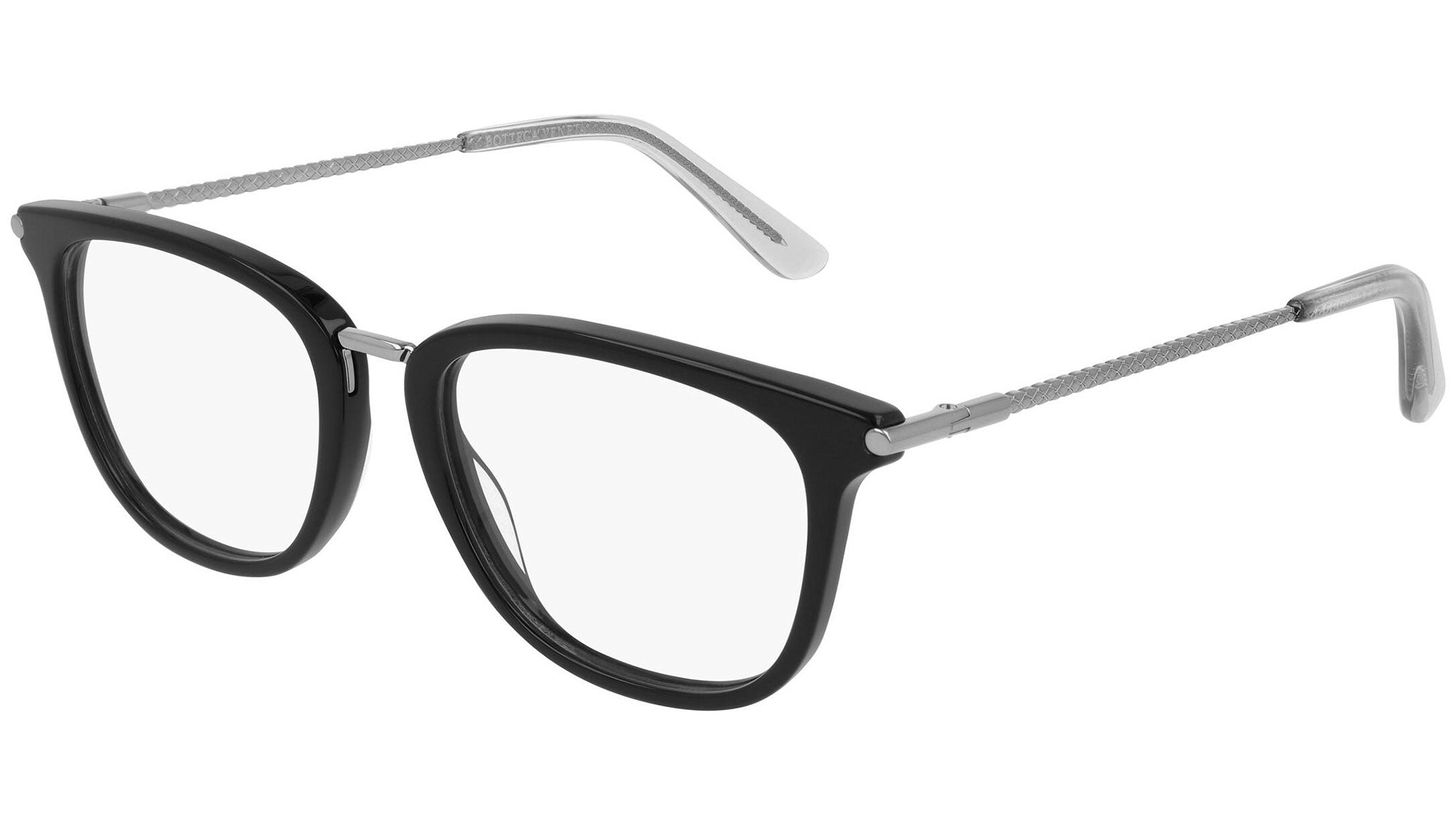 Occhiali da vista Bottega Veneta modello BV0256O 001 featuring shiny black / shiny dark ruthenium frame and ruthenium temple.