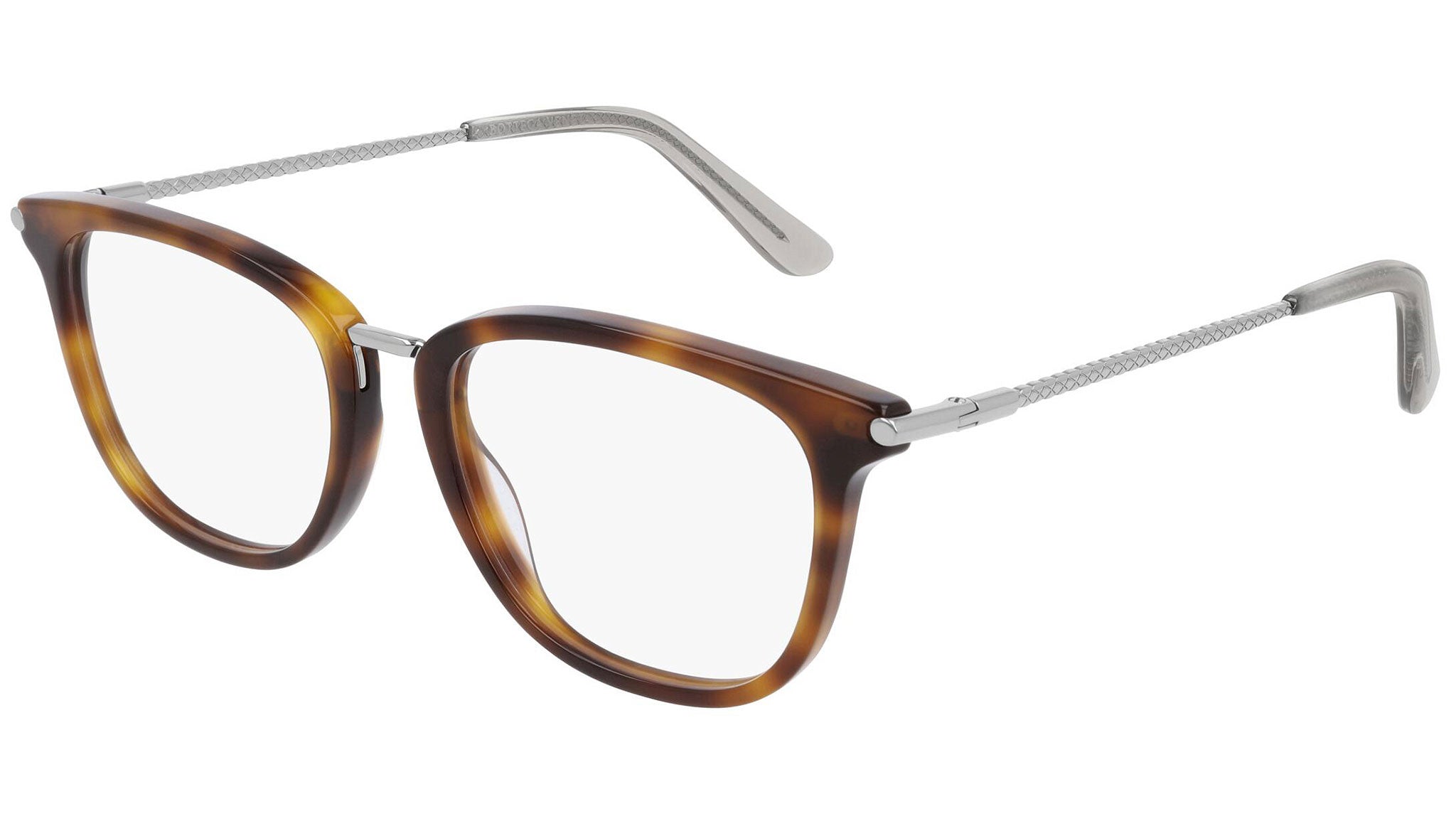 Occhiali da vista Bottega Veneta modello BV0256O 003 featuring shiny medium havana / shiny light ruthenium frame and ruthenium temple.