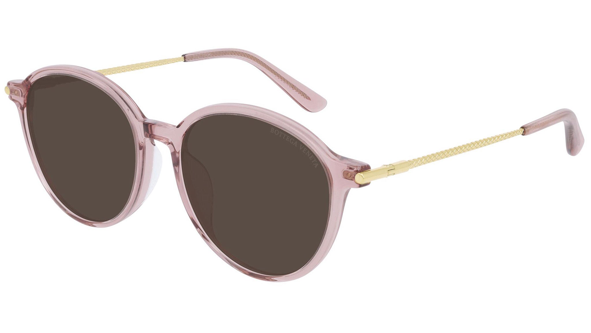 Bottega Veneta sunglasses collection model BV0260SK 003 featuring shiny transparent pink / shiny red gold frame and solid brown lens. Inspired by Italian culture with a global outlook, the House is defined by a distinctly refined attitude. Bottega Veneta uses noble materials to create considered pieces that become part of their owner’s lives.