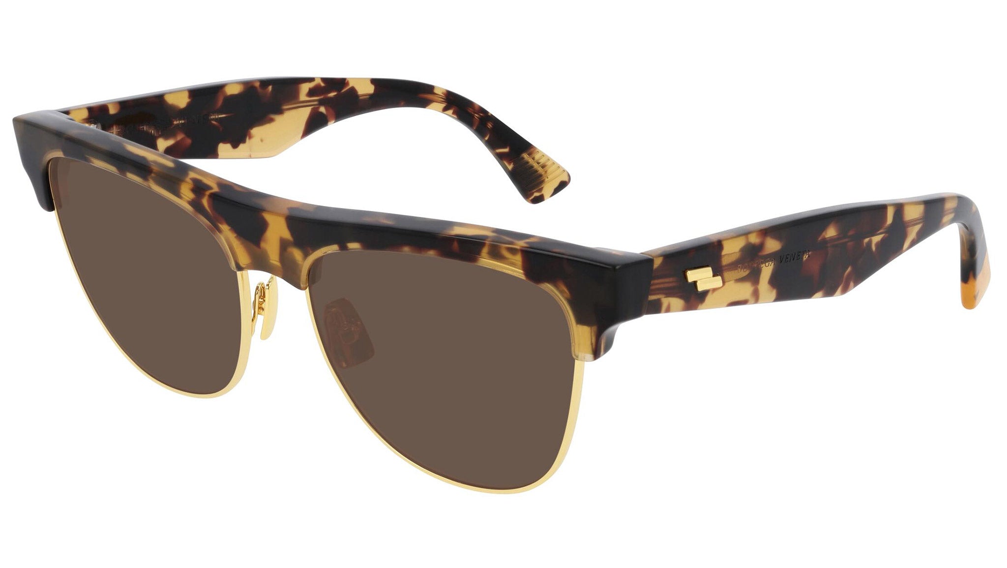 Bottega Veneta sunglasses collection model 1003S 002 featuring shiny havana yellow black brown and matte endura gold front frame and solid cigar brown lens. Inspired by Italian culture with a global outlook, the House is defined by a distinctly refined attitude. Bottega Veneta uses noble materials to create considered pieces that become part of their owner’s lives.