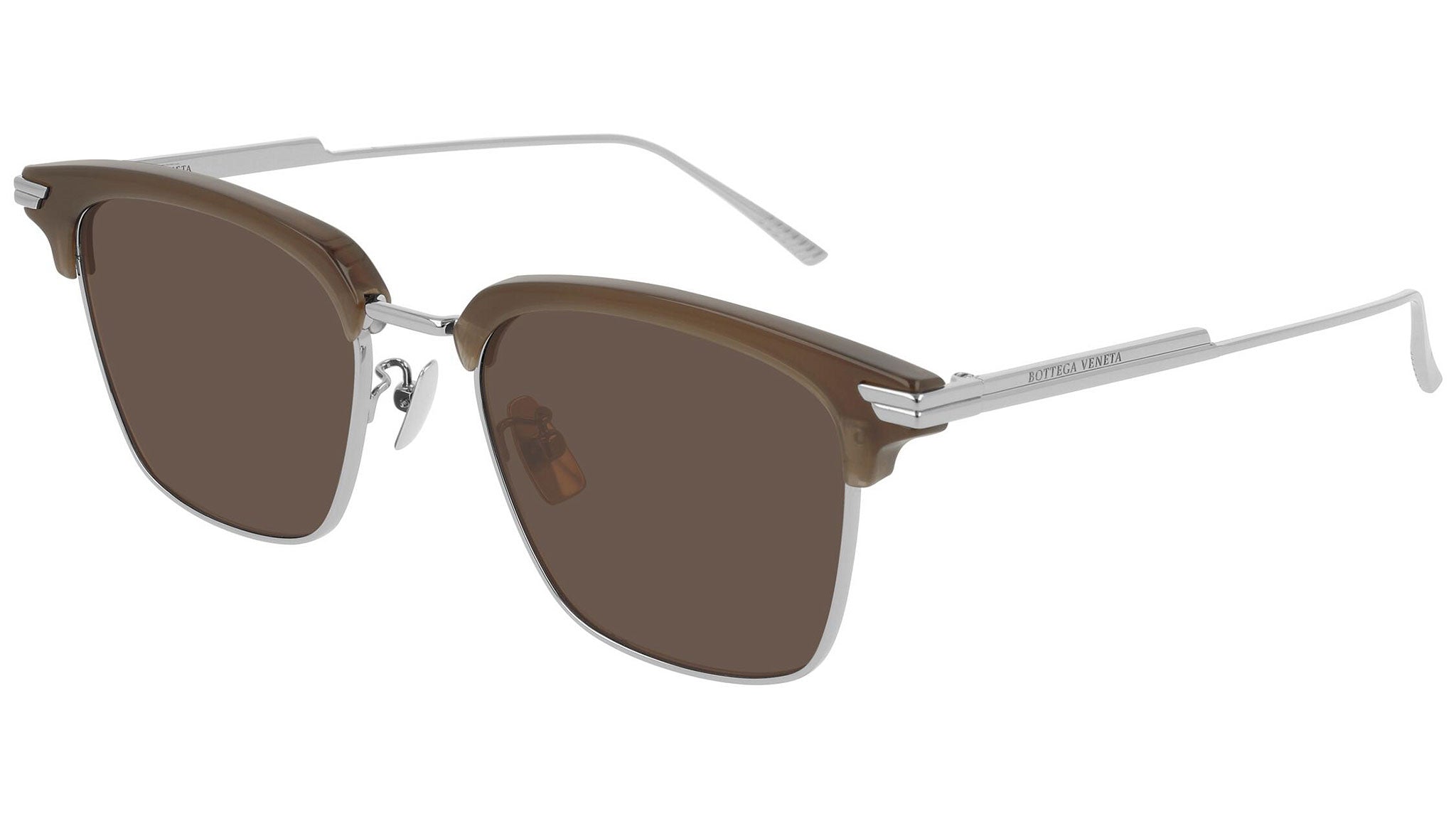Bottega Veneta sunglasses collection model BV1007SK 004 featuring shiny milky chocolate brown / shiny light ruthenium frame and solid nicotine lens. Inspired by Italian culture with a global outlook, the House is defined by a distinctly refined attitude. Bottega Veneta uses noble materials to create considered pieces that become part of their owner’s lives.