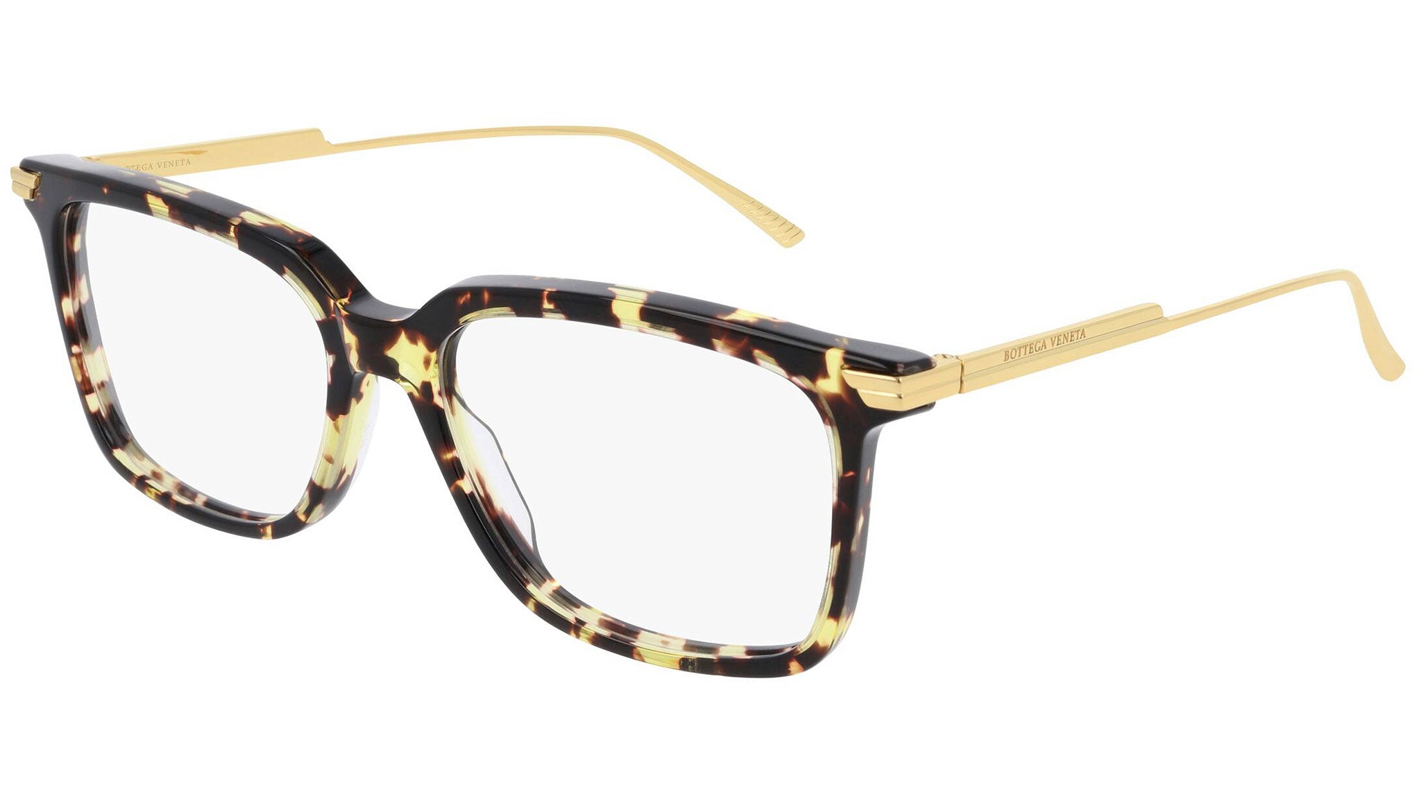 Occhiali da vista Bottega Veneta modello BV1009O 008 featuring shiny spotted havana / shiny gold frame and gold temple.
